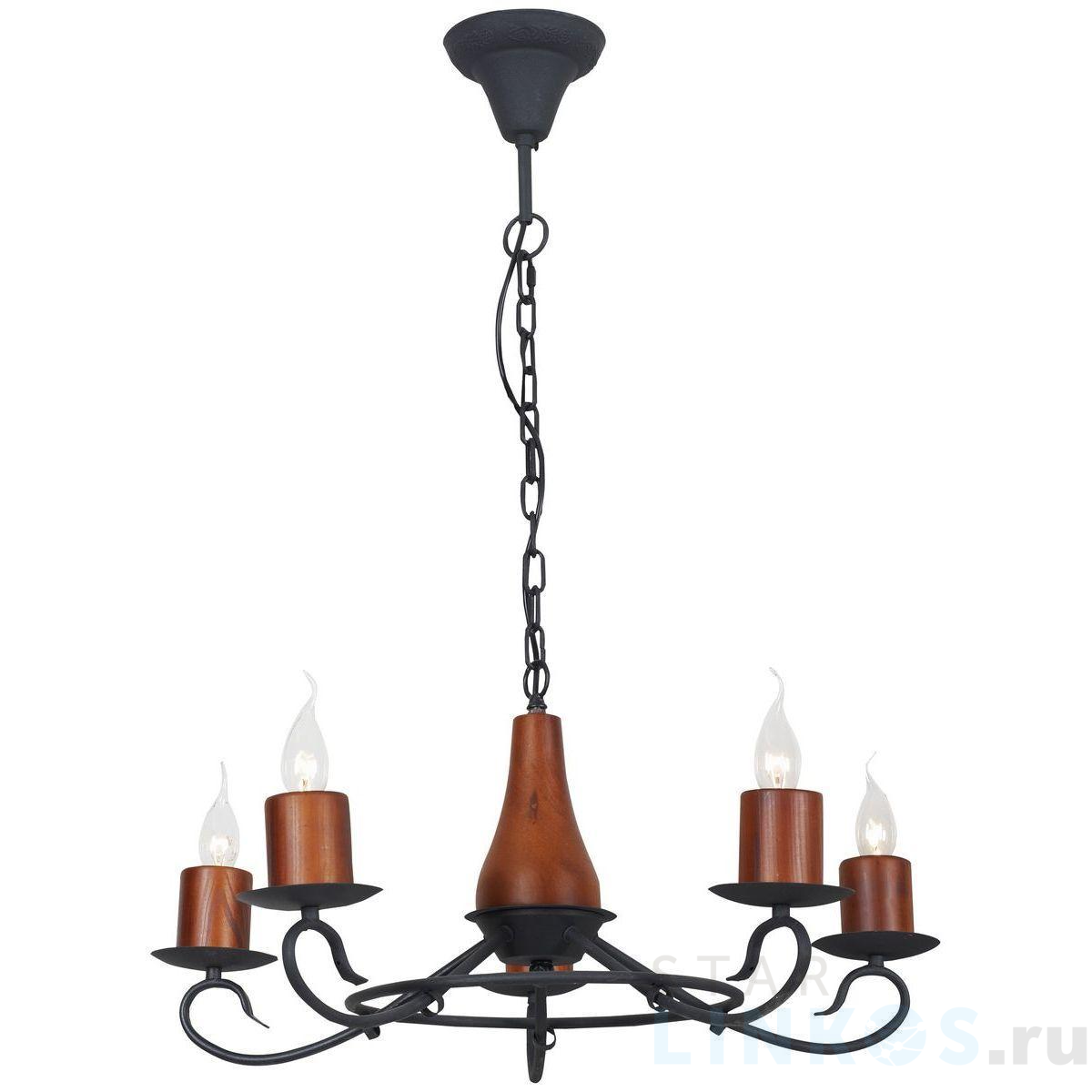 Поставщик рекомендует использовать лампы накаливания с цоколем E14 для освещения площади 11,1 м2. Подвесная люстра Velante 590-703-05 в кантри-стиле используется в интерьере кафе и ресторанов с установкой на потолок.