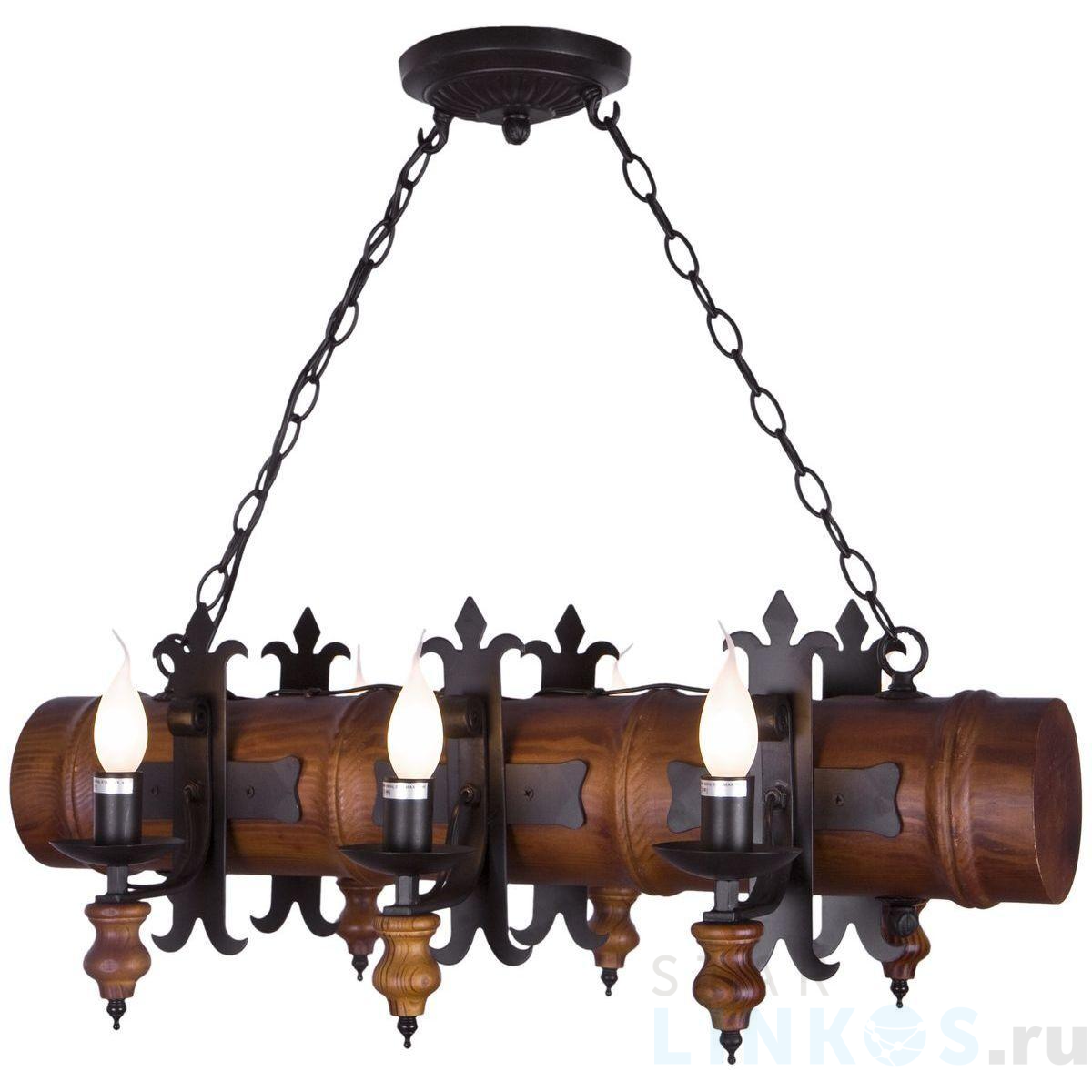 Поставщик рекомендует использовать лампы накаливания с цоколем E14 для освещения площади 13,3 м2. Подвесная люстра Velante 599-703-06 в кантри-стиле используется в интерьере кафе и ресторанов с установкой на потолок.