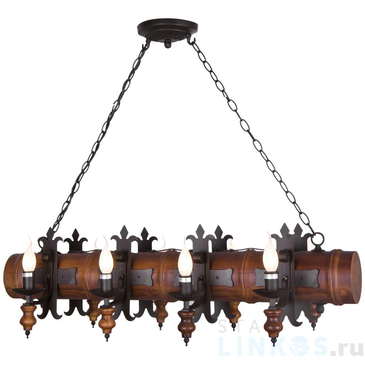 Поставщик рекомендует использовать лампы накаливания с цоколем E14 для освещения площади 17,8 м2. Подвесная люстра Velante 599-703-08 в кантри-стиле используется в интерьере кафе и ресторанов с установкой на потолок.
