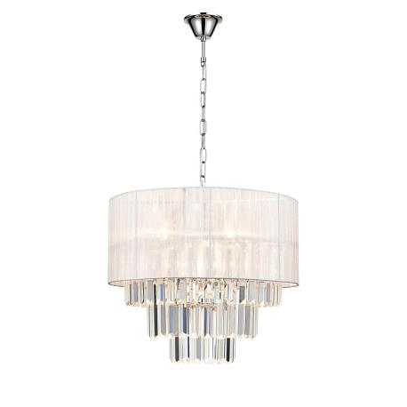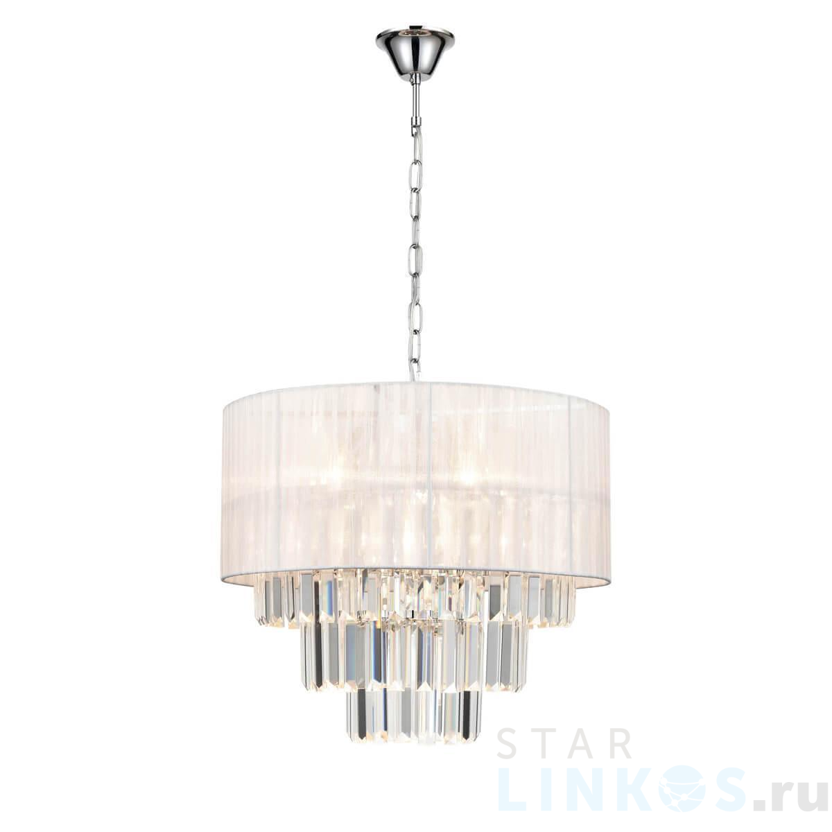 Поставщик рекомендует использовать лампы накаливания с цоколем E14 для освещения площади 15,6 м2. Подвесная люстра Vele Luce Fata VL3173P07 в стиле арт-деко используется в интерьере гостиной с установкой на потолок.
