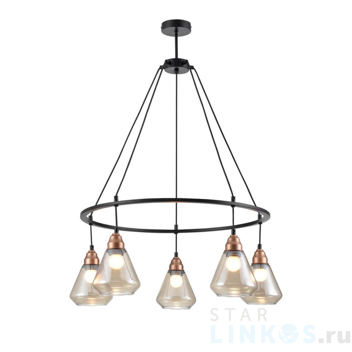 Поставщик рекомендует использовать лампы накаливания с цоколем E27 для освещения площади 12 м2. Подвесная люстра Vele Luce Norina VL5842P05 в используется в интерьере гостиной с установкой на потолок.