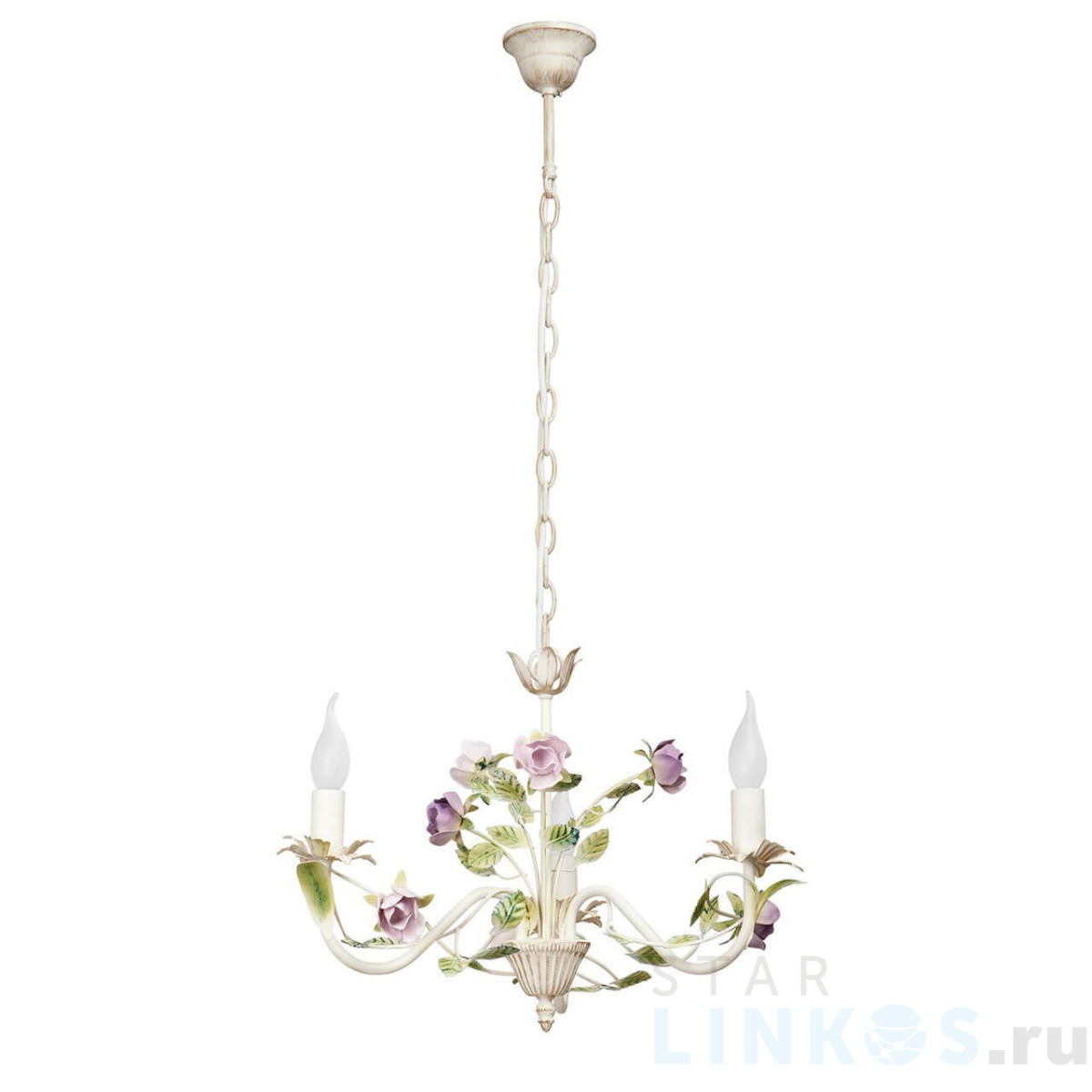 Поставщик рекомендует использовать лампы накаливания с цоколем E14 для освещения площади 6,7 м2. Подвесная люстра Vitaluce V1184/3 в стиле прованс используется в интерьере гостиной с установкой на потолок.