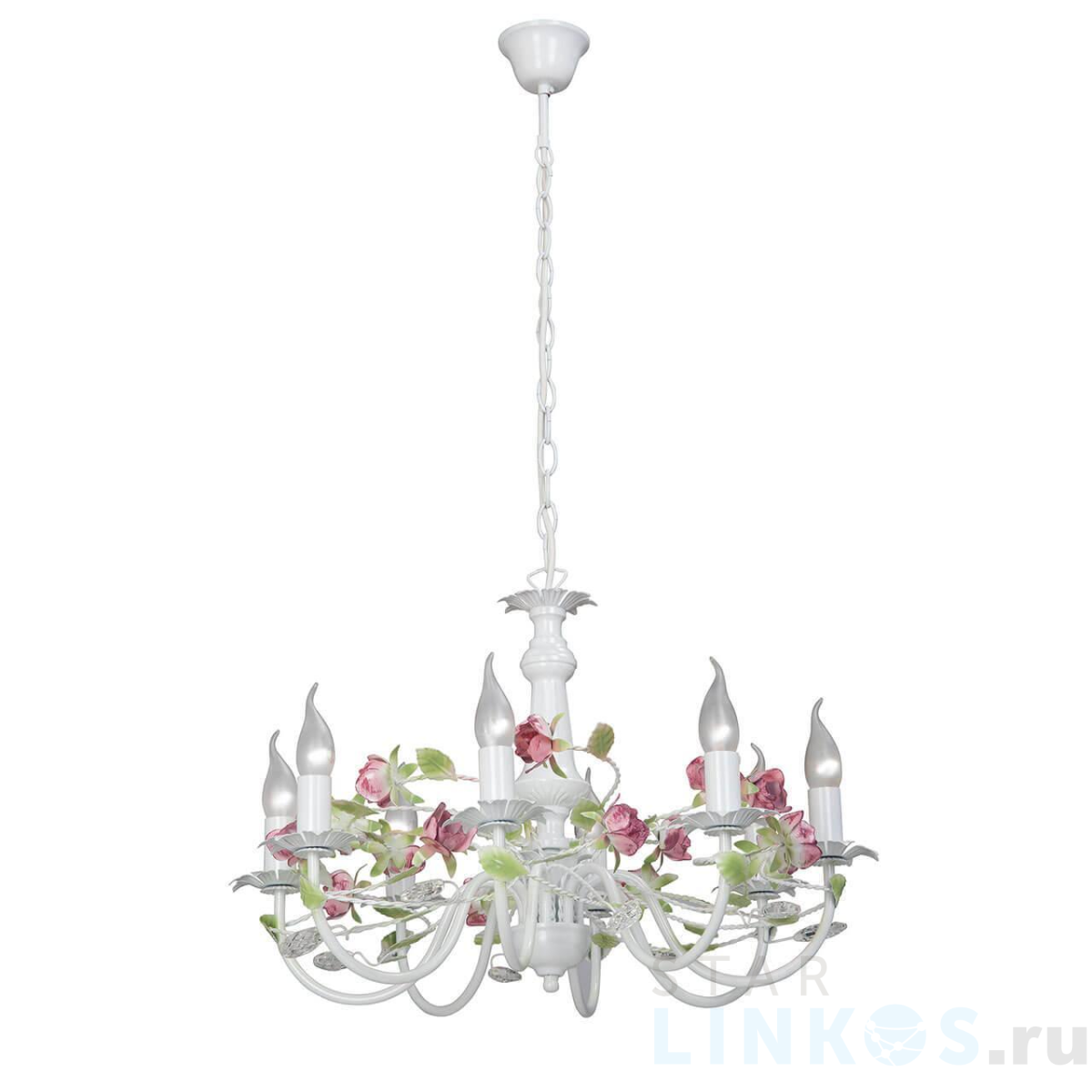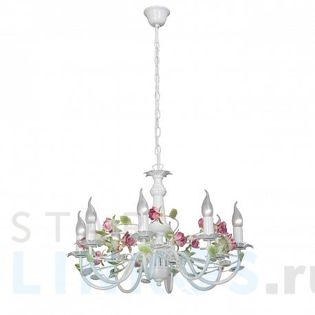 Поставщик рекомендует использовать лампы накаливания с цоколем E14 для освещения площади 17,8 м2. Подвесная люстра Vitaluce V1276/8 в стиле прованс используется в интерьере гостиной с установкой на потолок.