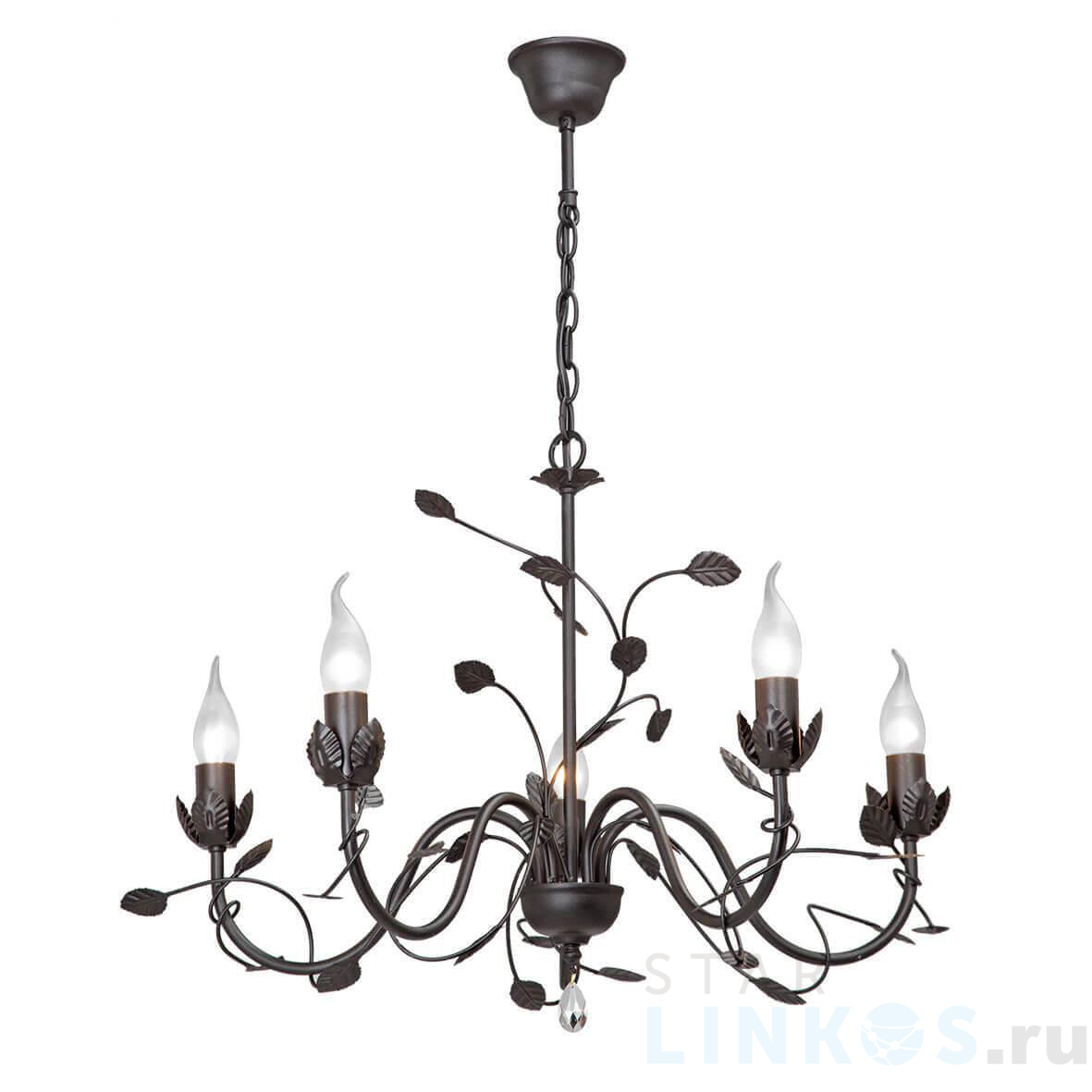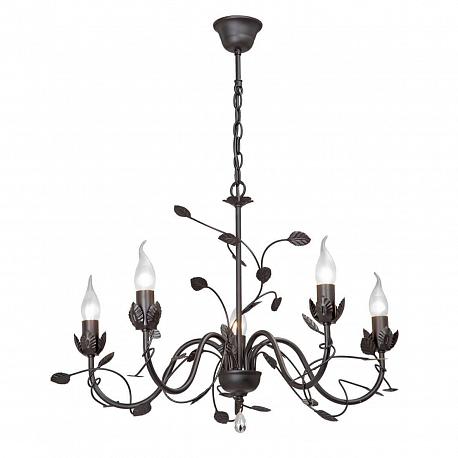 Поставщик рекомендует использовать лампы накаливания с цоколем E14 для освещения площади 11,1 м2. Подвесная люстра Vitaluce V1661-1/5 в стиле прованс используется в интерьере гостиной с установкой на потолок.