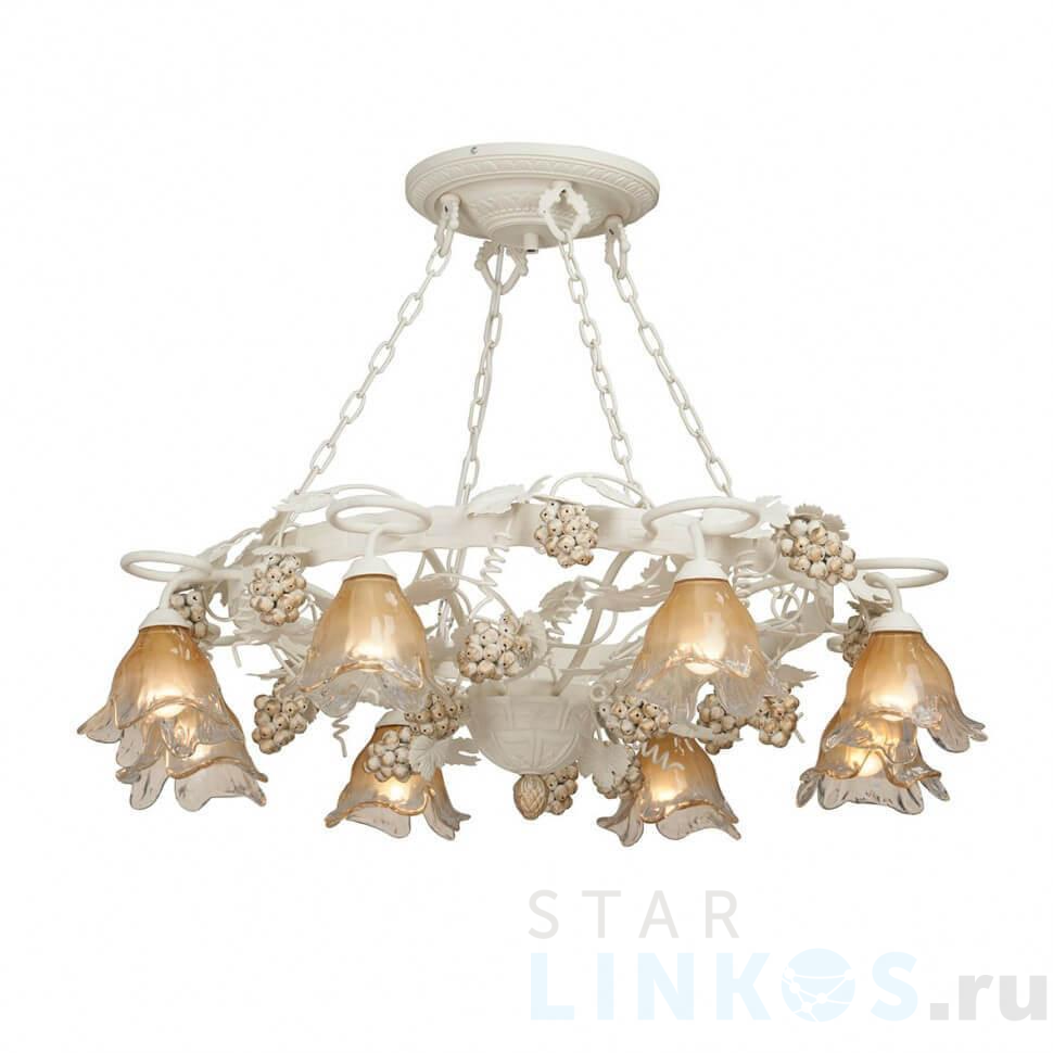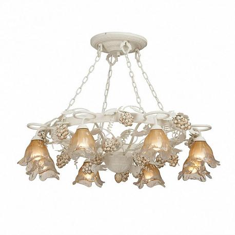 Поставщик рекомендует использовать лампы накаливания с цоколем E14 для освещения площади 17,8 м2. Подвесная люстра Vitaluce V1737/8 в стиле прованс используется в интерьере гостиной с установкой на потолок.