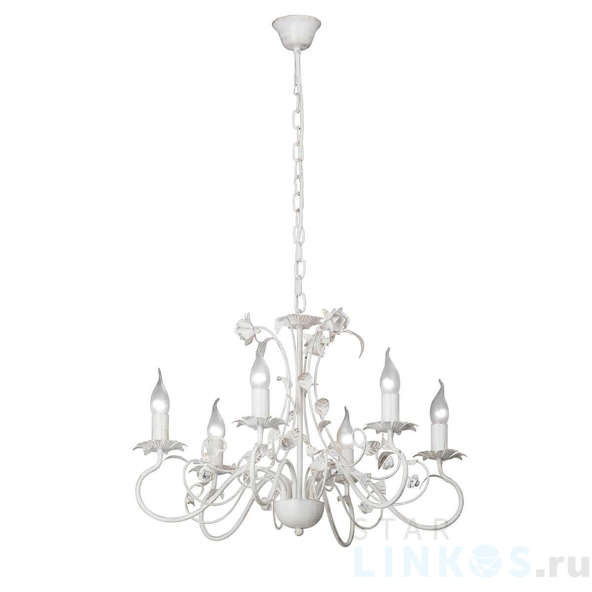 Поставщик рекомендует использовать лампы накаливания с цоколем E14 для освещения площади 12 м2. Подвесная люстра Vitaluce V1771-0/6 в стиле прованс используется в интерьере гостиной с установкой на потолок.