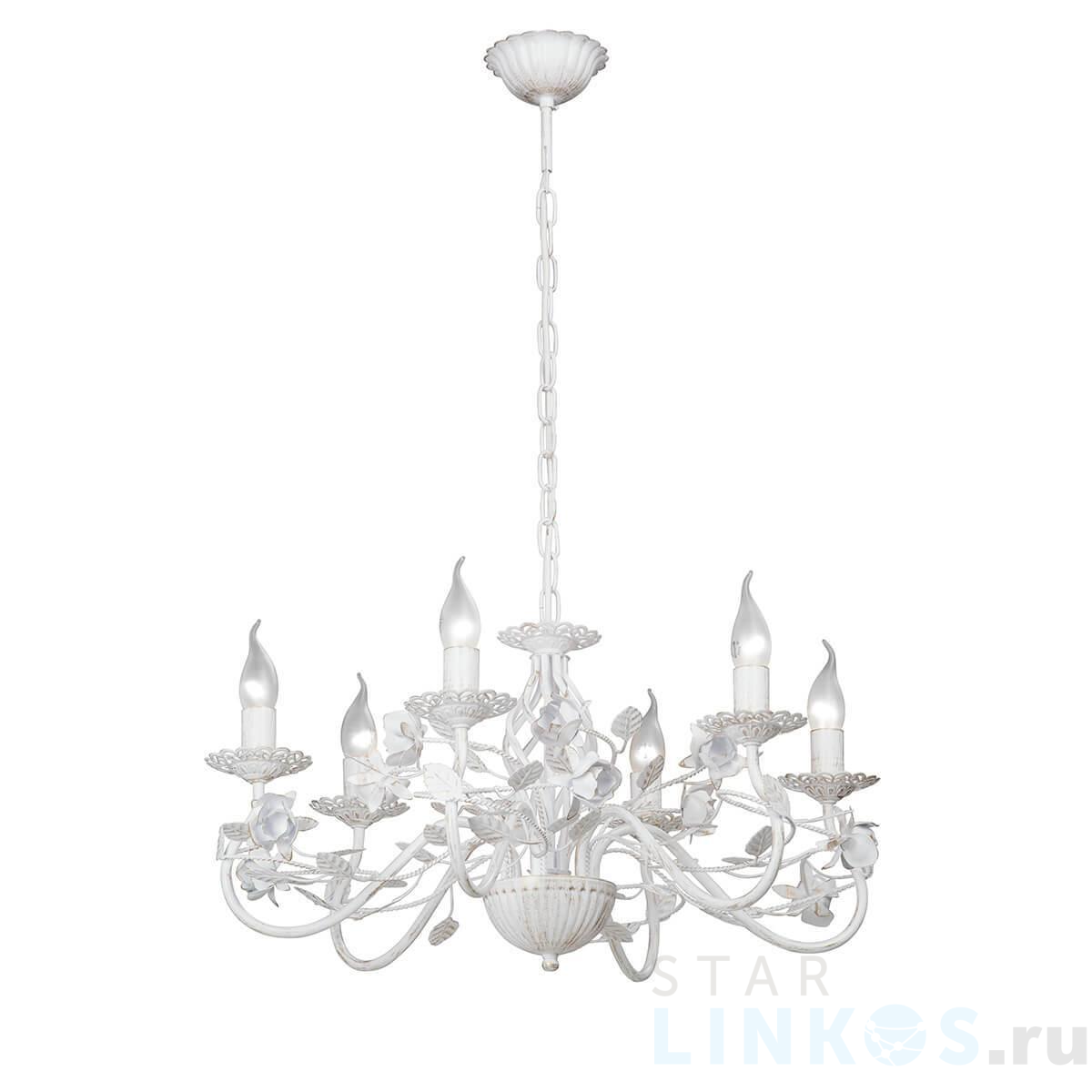 Поставщик рекомендует использовать лампы накаливания с цоколем E14 для освещения площади 13,3 м2. Подвесная люстра Vitaluce V1778-0/6 в стиле прованс используется в интерьере гостиной с установкой на потолок.
