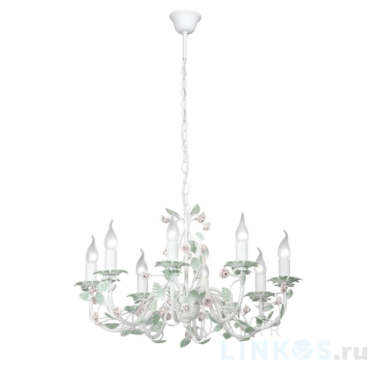 Поставщик рекомендует использовать лампы накаливания с цоколем E14 для освещения площади 16 м2. Подвесная люстра Vitaluce V1782-0/8 в стиле прованс используется в интерьере гостиной с установкой на потолок.