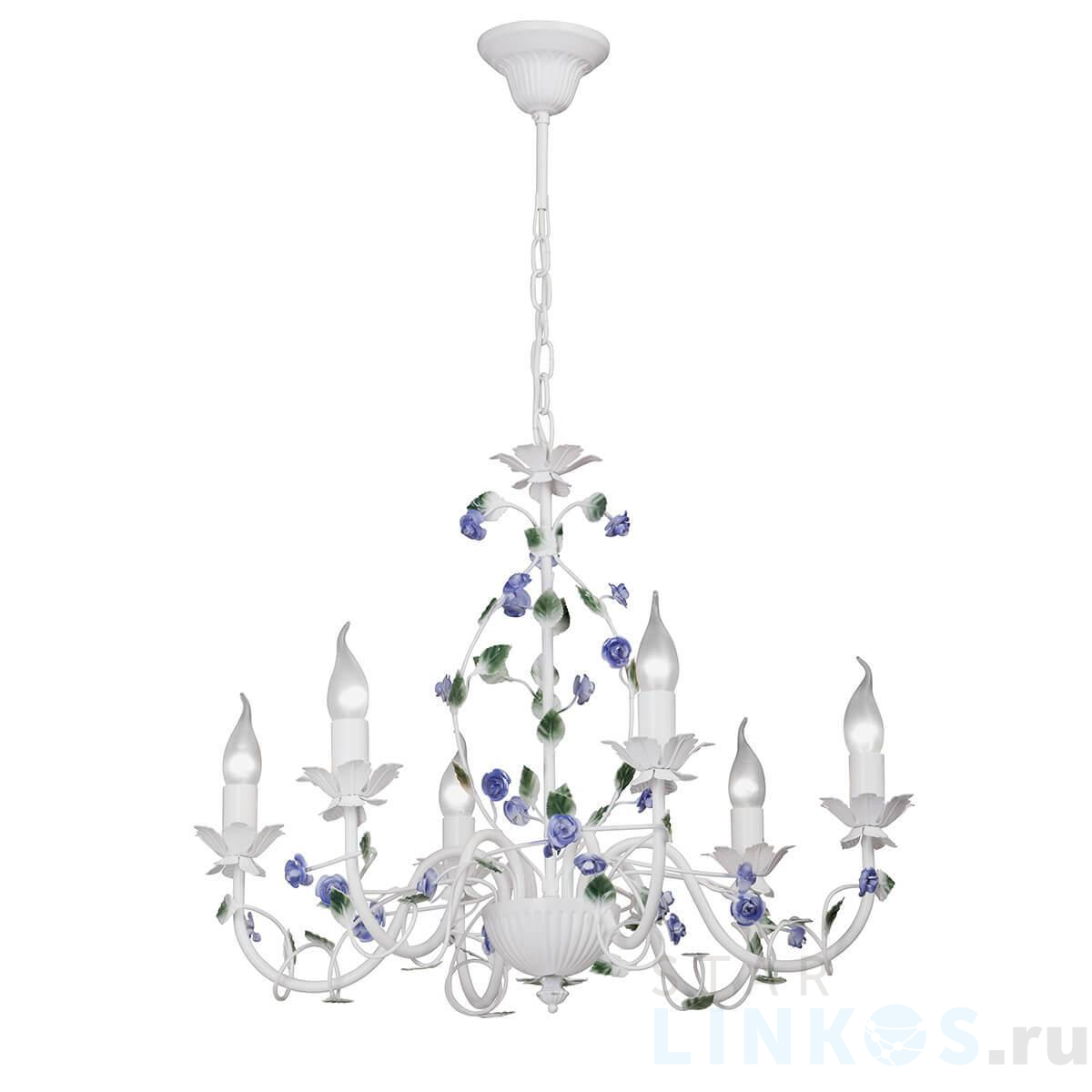 Поставщик рекомендует использовать лампы накаливания с цоколем E14 для освещения площади 18 м2. Подвесная люстра Vitaluce V1794-0/6 в стиле прованс используется в интерьере гостиной с установкой на потолок.