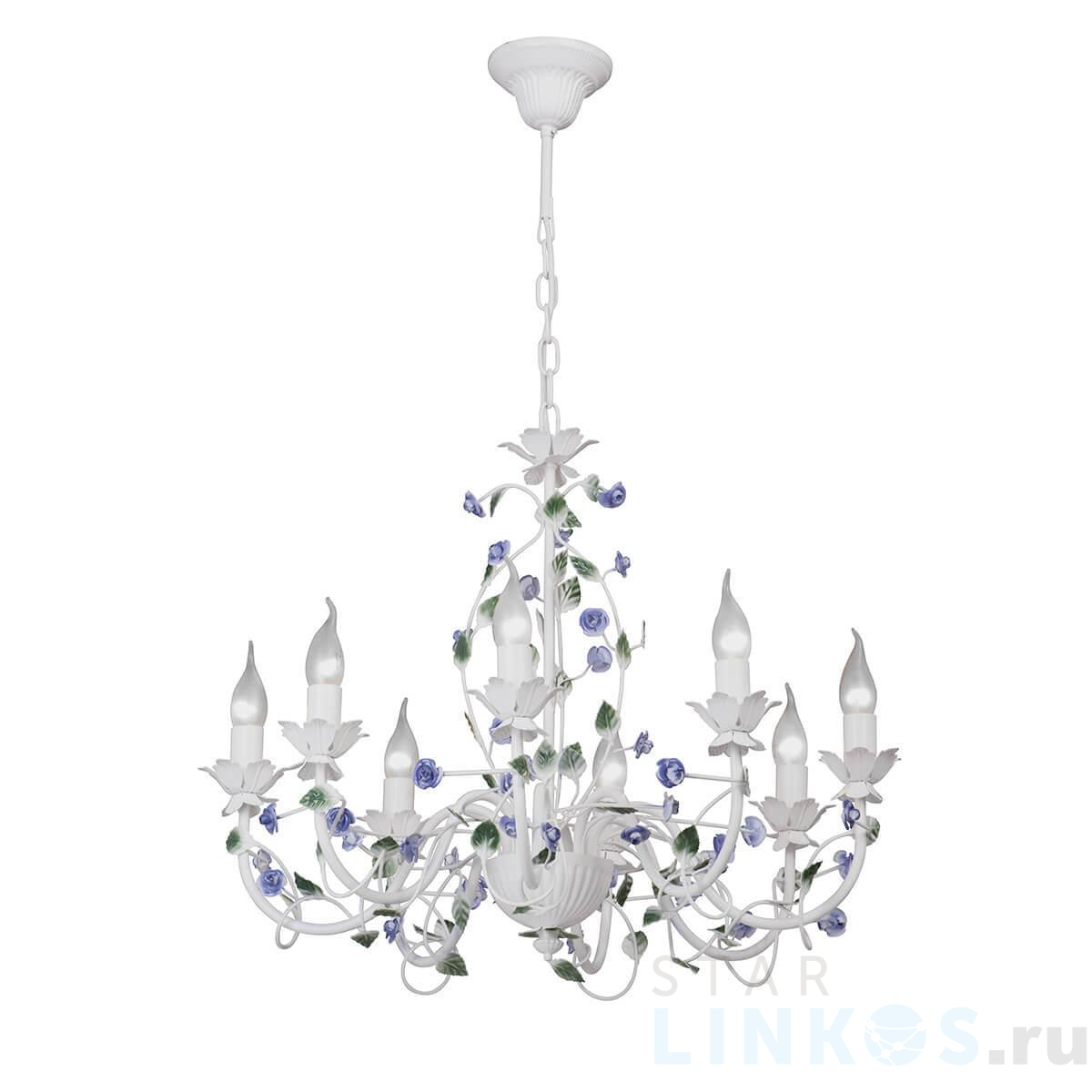 Поставщик рекомендует использовать лампы накаливания с цоколем E14 для освещения площади 24 м2. Подвесная люстра Vitaluce V1794-0/8 в стиле прованс используется в интерьере гостиной с установкой на потолок.