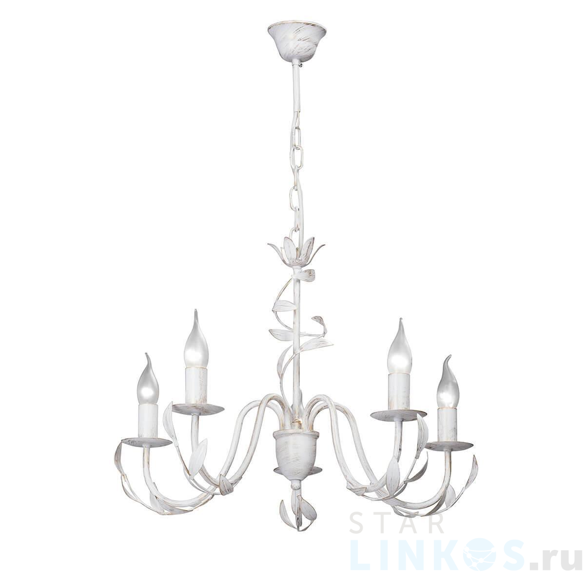 Поставщик рекомендует использовать лампы накаливания с цоколем E14 для освещения площади 10 м2. Подвесная люстра Vitaluce V1832-0/5 в стиле прованс используется в интерьере гостиной с установкой на потолок.