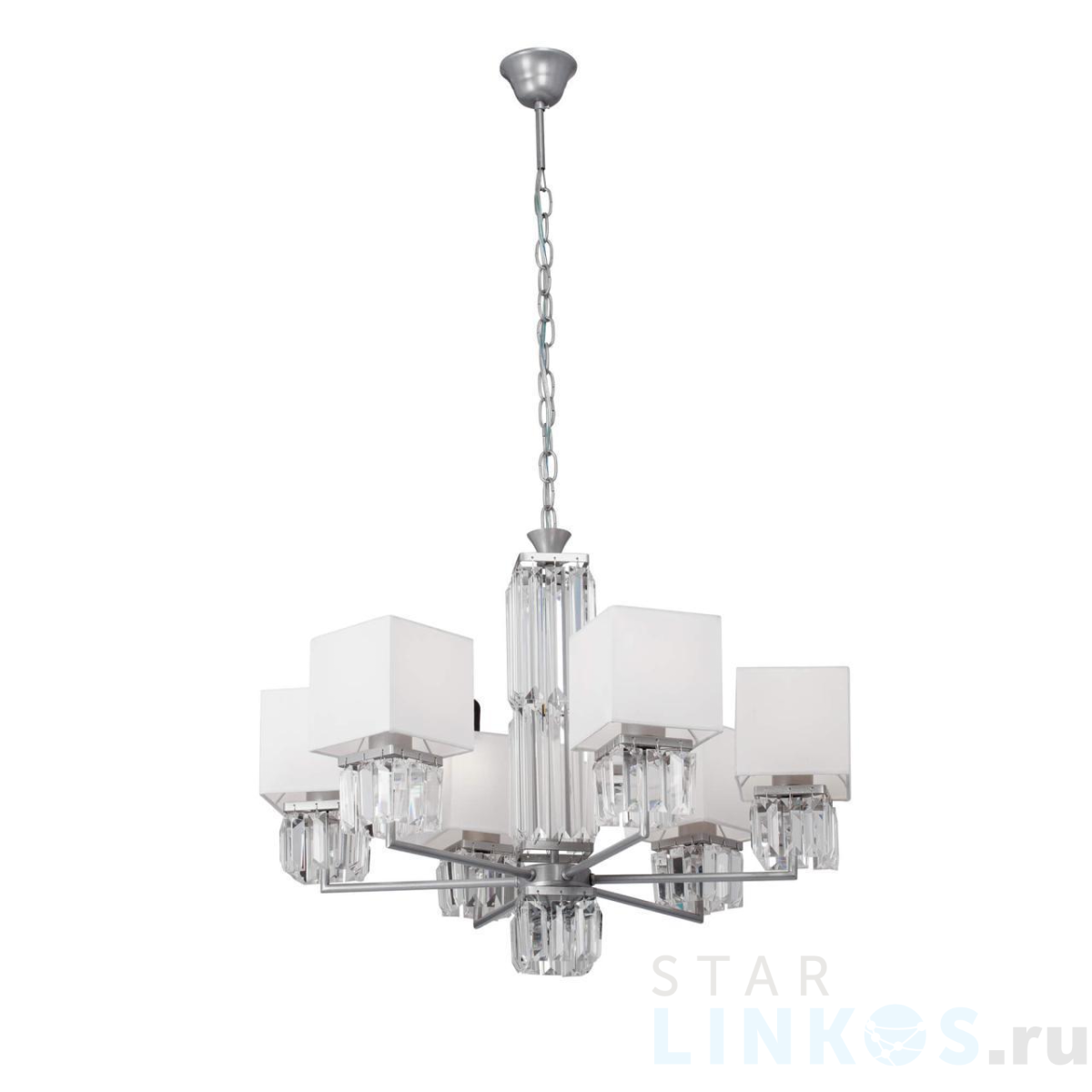 Поставщик рекомендует использовать лампы накаливания с цоколем E14 для освещения площади 18 м2. Подвесная люстра Vitaluce V1856-9/6 в стиле арт-деко используется в интерьере гостиной с установкой на потолок.