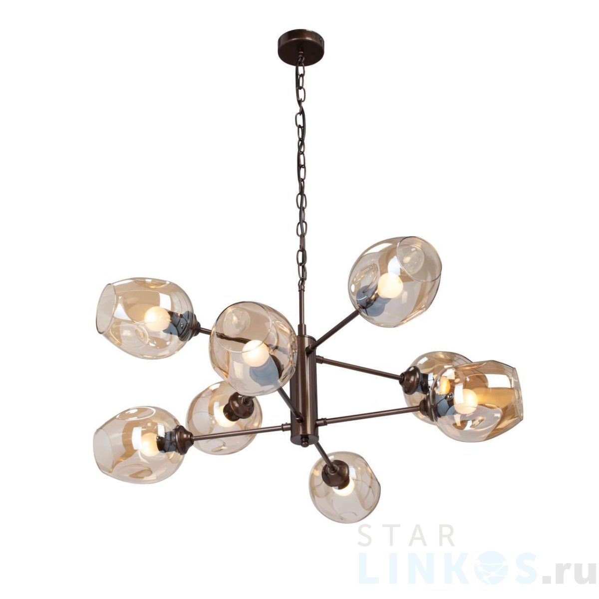 Поставщик рекомендует использовать лампы накаливания с цоколем E27 для освещения площади 24 м2. Подвесная люстра Vitaluce V3956-7/8 в стиле арт-деко используется в интерьере гостиной с установкой на потолок.
