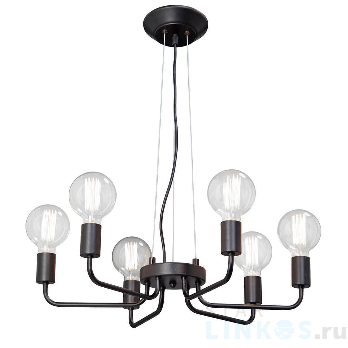 Поставщик рекомендует использовать лампы накаливания с цоколем E27 для освещения площади 20 м2. Подвесная люстра Vitaluce V4254-1/6 в стиле лофт используется в интерьере гостиной с установкой на потолок.