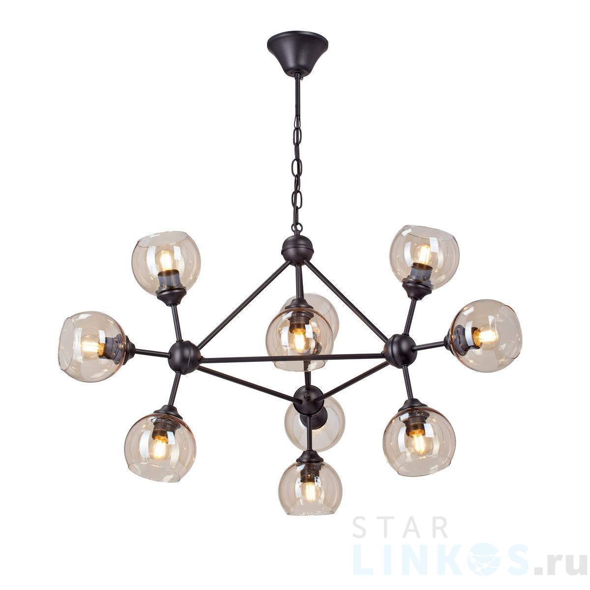 Поставщик рекомендует использовать лампы накаливания с цоколем E27 для освещения площади 30 м2. Подвесная люстра Vitaluce V43200-13/10 в стиле Хай-Тек используется в интерьере гостиной с установкой на потолок.