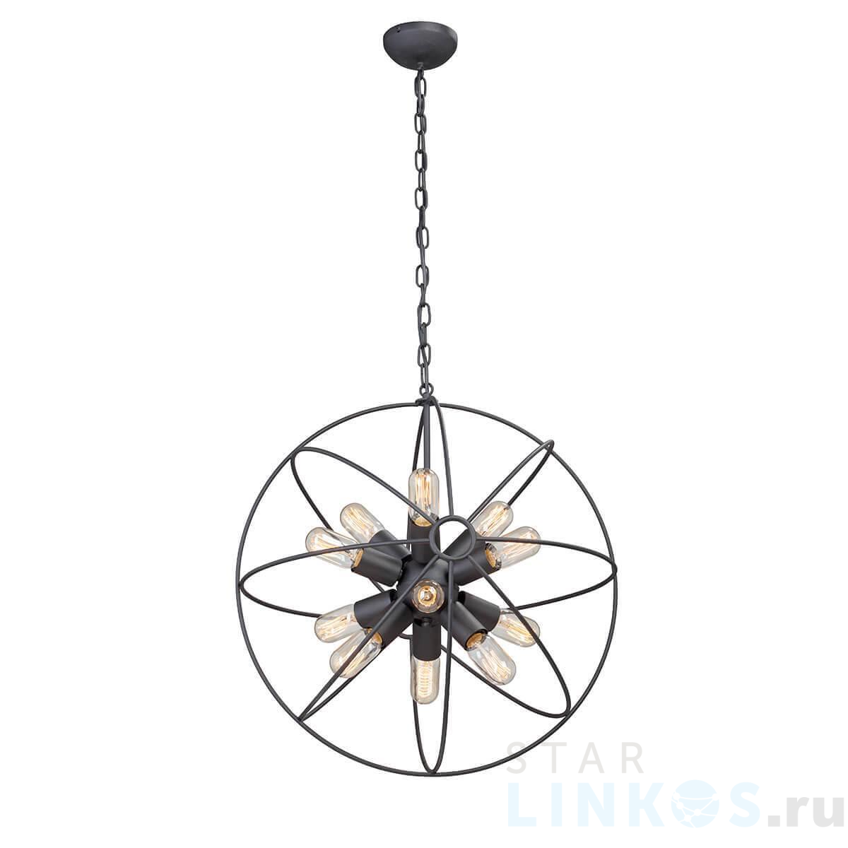 Поставщик рекомендует использовать лампы накаливания с цоколем E27 для освещения площади 36 м2. Подвесная люстра Vitaluce V4576-1/12 в стиле лофт используется в интерьере гостиной с установкой на потолок.