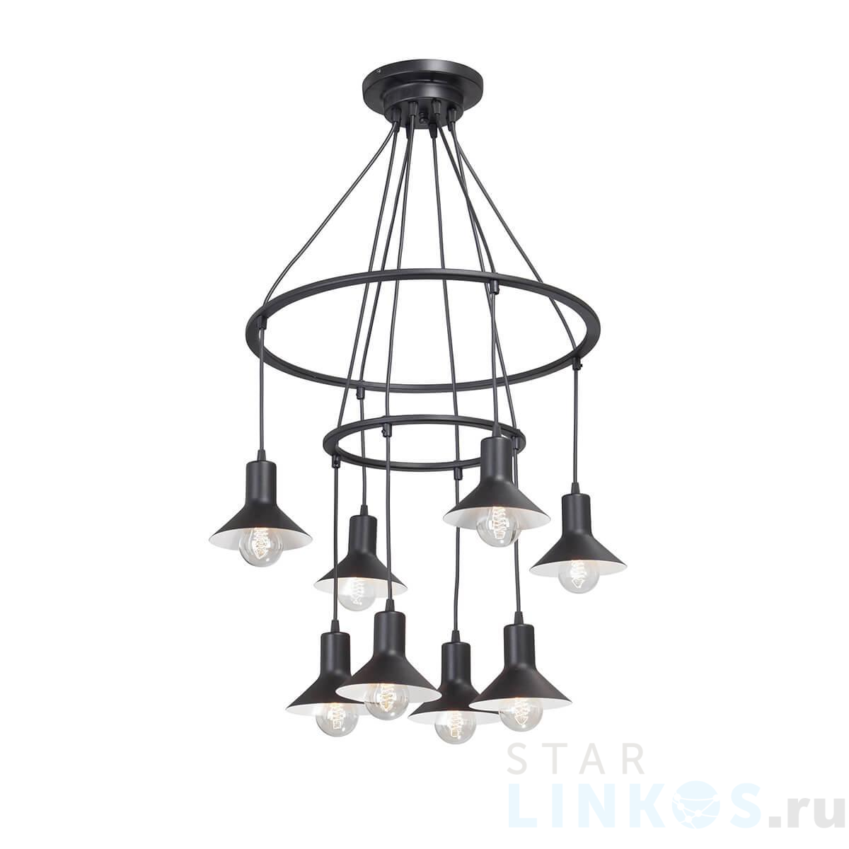 Поставщик рекомендует использовать лампы накаливания с цоколем E27 для освещения площади 17,8 м2. Подвесная люстра Vitaluce V4947-1/8S в стиле лофт используется в интерьере гостиной с установкой на потолок.