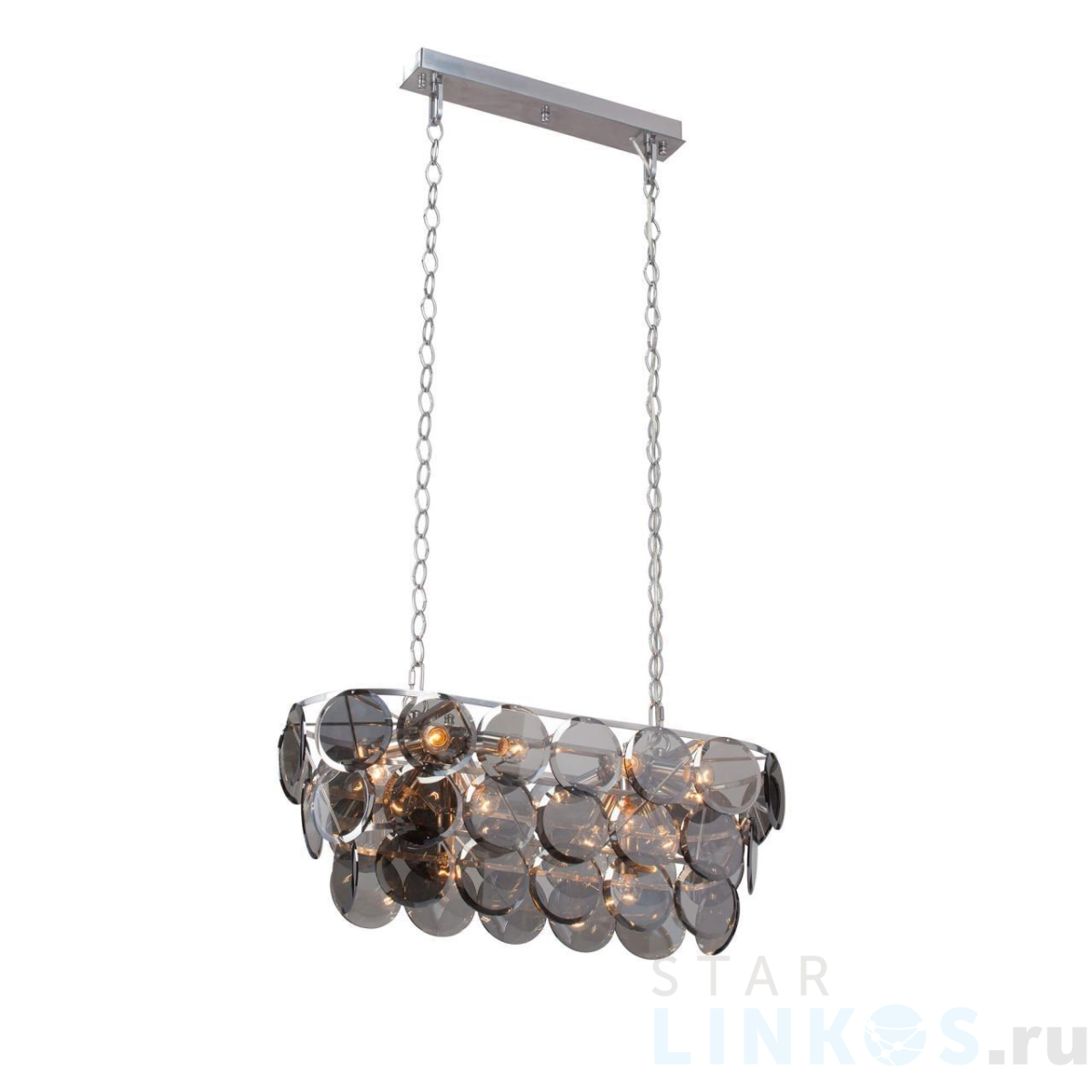 Поставщик рекомендует использовать лампы накаливания с цоколем E14 для освещения площади 54 м2. Подвесная люстра Vitaluce V5850-9/18 в используется в интерьере гостиной с установкой на потолок.