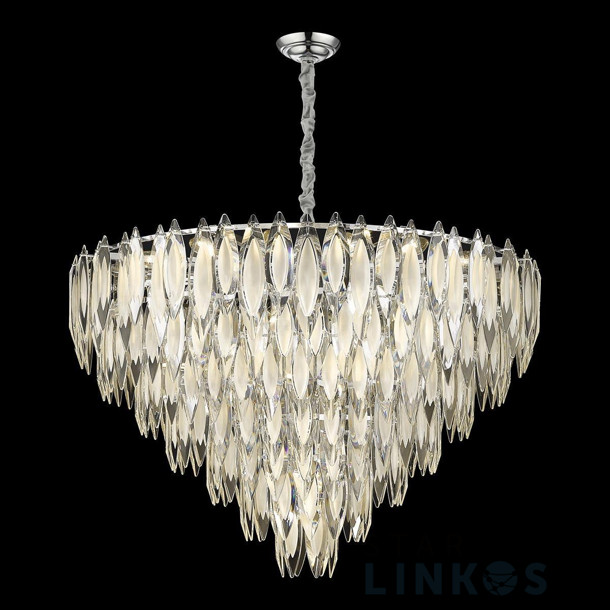 Поставщик рекомендует использовать лампы накаливания с цоколем E14 для освещения площади 74 м2. Подвесная люстра Wertmark Orlanda WE144.33.103 в стиле арт-деко используется в интерьере больших залов с установкой на потолок.
