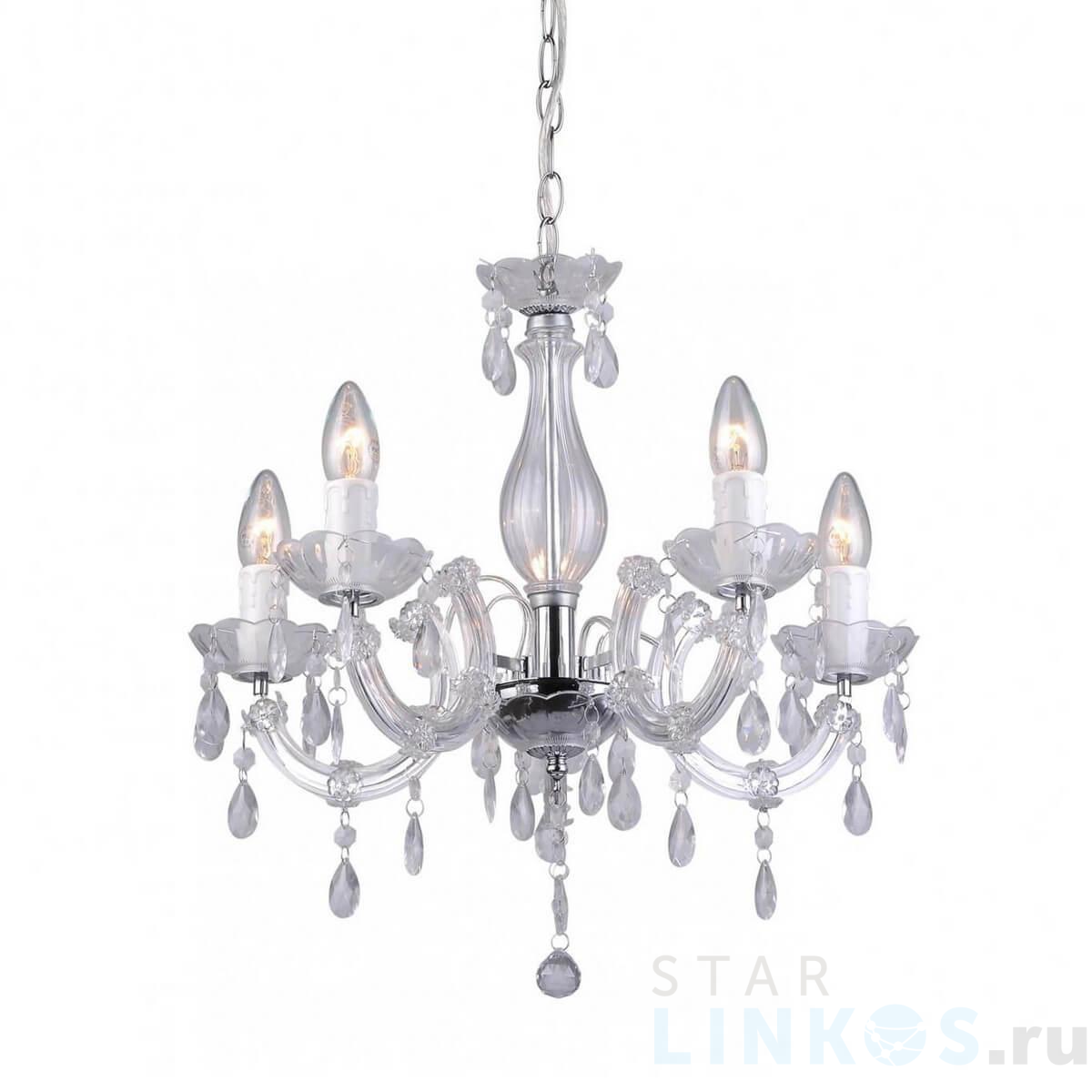 Поставщик рекомендует использовать лампы накаливания с цоколем E14. Подвесная люстра Zumaline Magnolia RLD94016-5A в стиле арт-деко используется в интерьере гостиной с установкой на потолок.