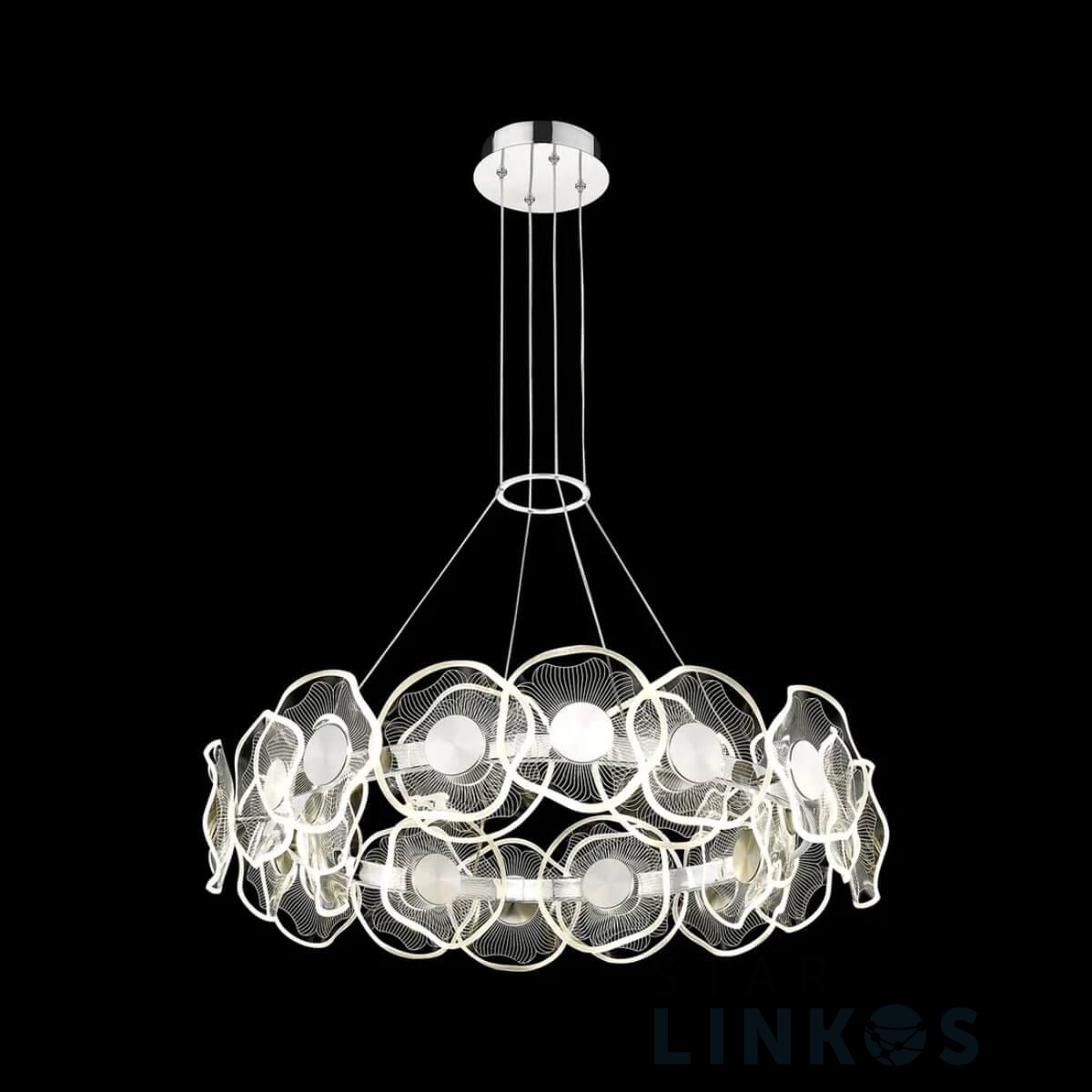 Подвесная светодиодная люстра Wertmark HELENA WE453.24.103 в современном стиле используется в интерьере гостиной с установкой на потолок.