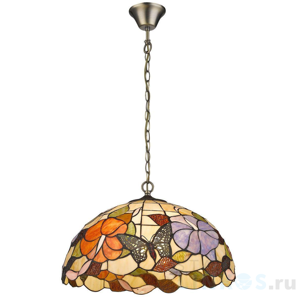Поставщик рекомендует использовать лампы накаливания с цоколем E27 для освещения площади 10 м2. Подвесная люстра Velante 816-806-03 в стиле Тиффани используется в интерьере гостиной с установкой на потолок.