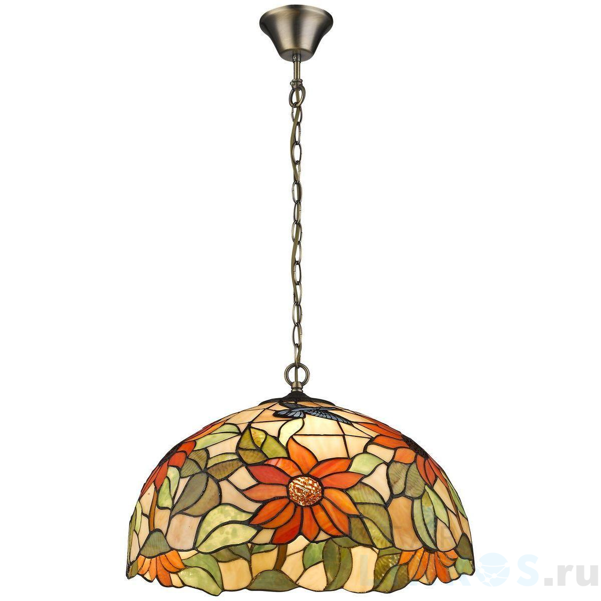 Поставщик рекомендует использовать лампы накаливания с цоколем E27 для освещения площади 10 м2. Подвесная люстра Velante 817-806-03 в стиле Тиффани используется в интерьере спальни с установкой на потолок.