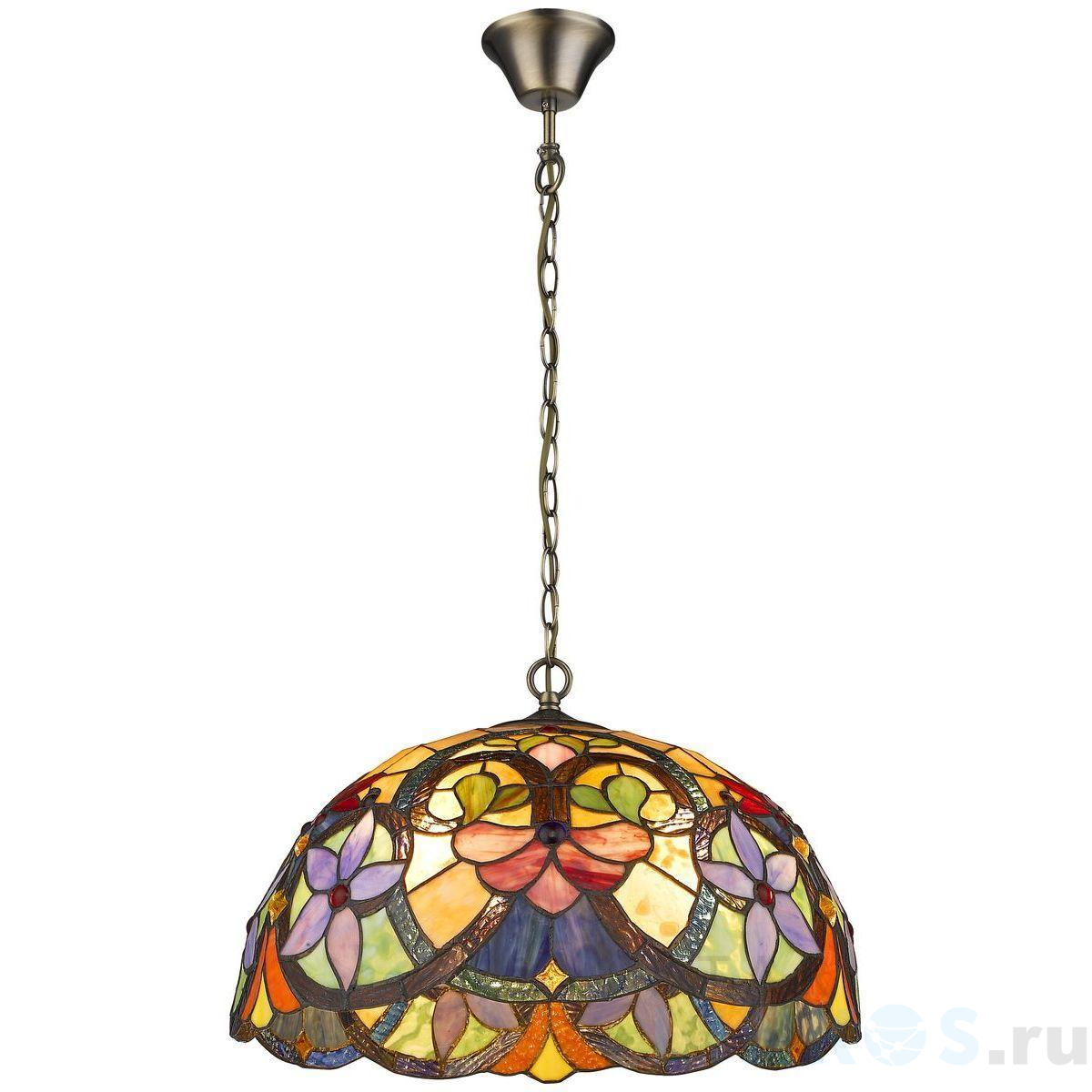Поставщик рекомендует использовать лампы накаливания с цоколем E27 для освещения площади 10 м2. Подвесная люстра Velante 818-806-03 в стиле Тиффани используется в интерьере гостиной с установкой на потолок.
