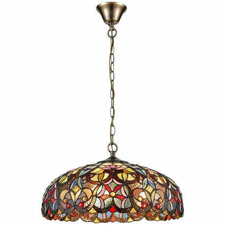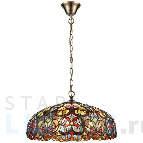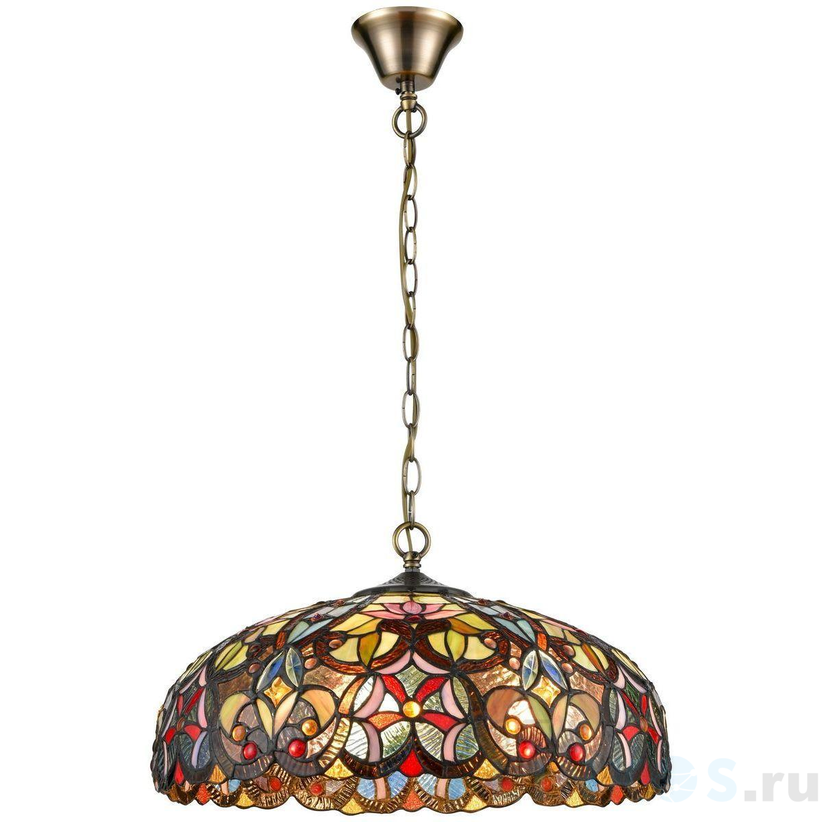 Поставщик рекомендует использовать лампы накаливания с цоколем E27 для освещения площади 10 м2. Подвесная люстра Velante 825-806-03 в стиле Тиффани используется в интерьере спальни с установкой на потолок.