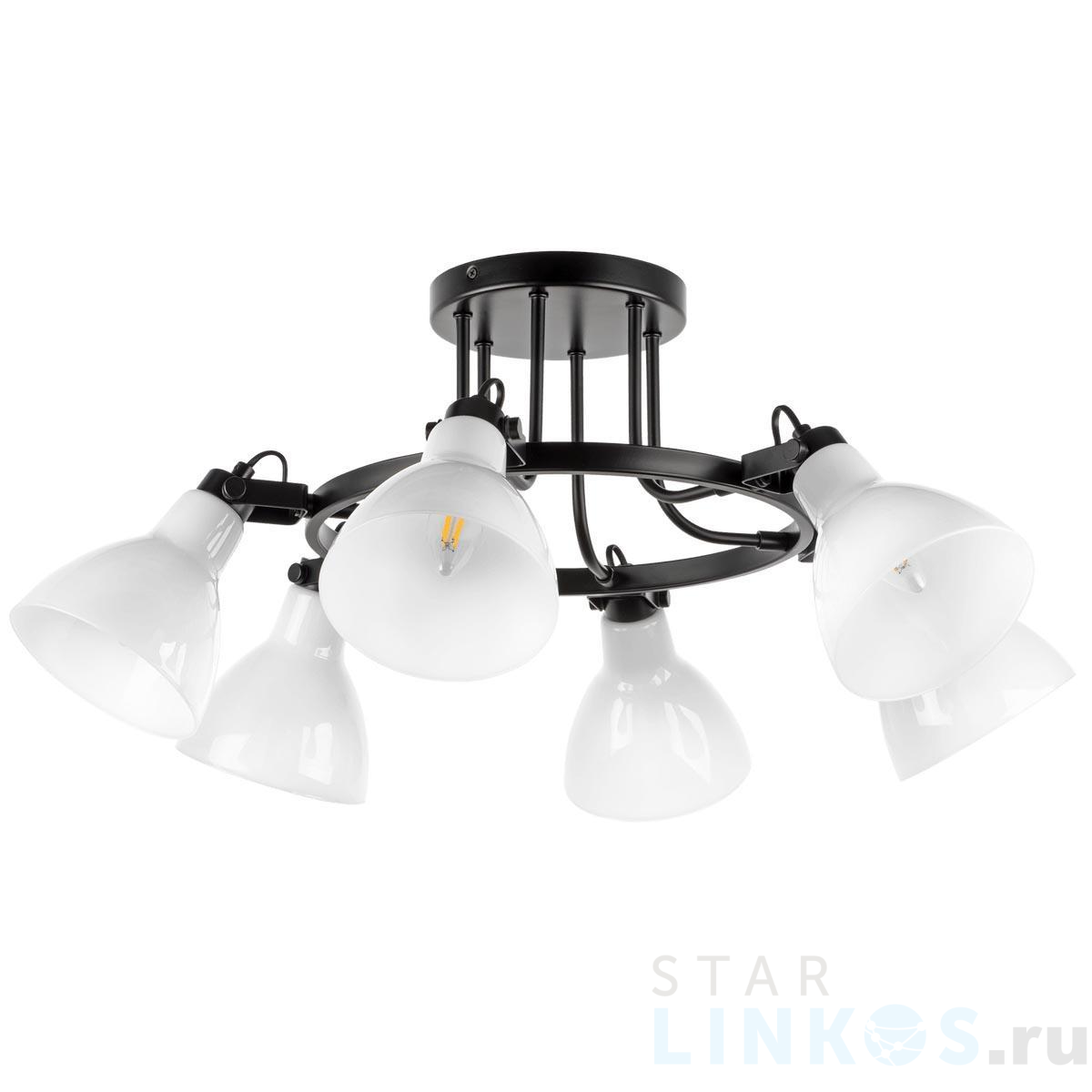 Поставщик рекомендует использовать лампы накаливания с цоколем E14 для освещения площади 13,3 м2. Потолочная люстра Lightstar Acrobata 761060 в стиле лофт используется в интерьере спальни с установкой на потолок.