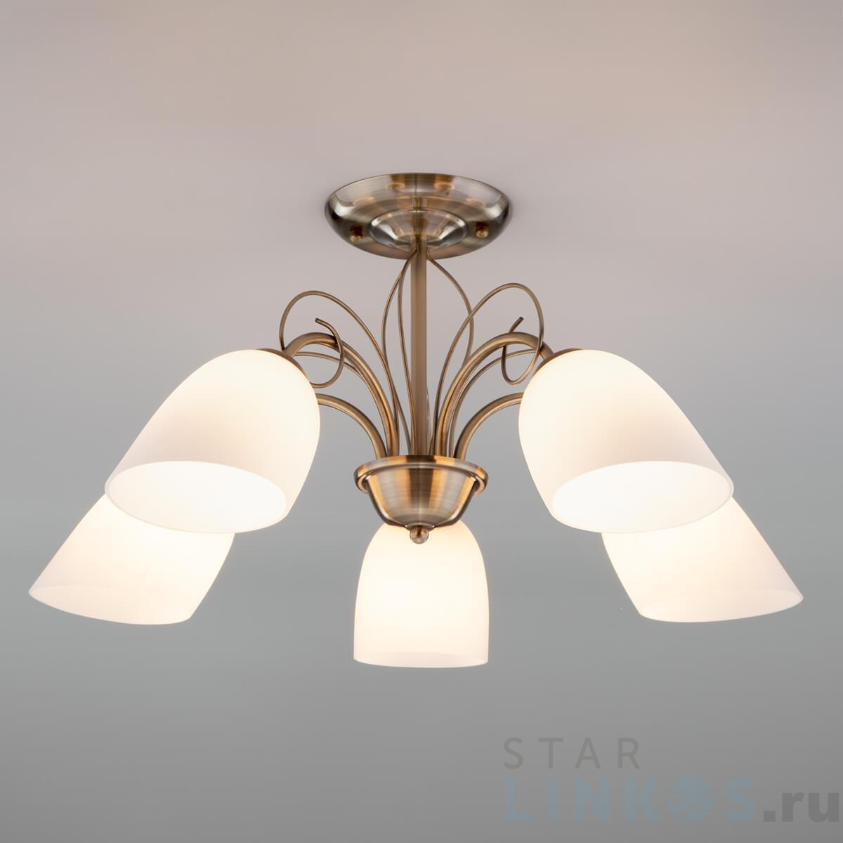 Поставщик рекомендует использовать лампы накаливания с цоколем E27. Подвесная люстра Eurosvet 30107/5 античная бронза в современном стиле используется в интерьере спальни с установкой на потолок.