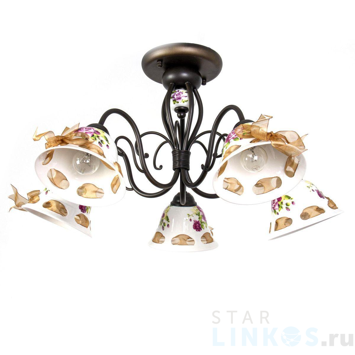 Поставщик рекомендует использовать лампы накаливания с цоколем E14 для освещения площади 12 м2. Потолочная люстра Abrasax Emilia MDK9424/5B Coffee в кантри-стиле используется с установкой на потолок.