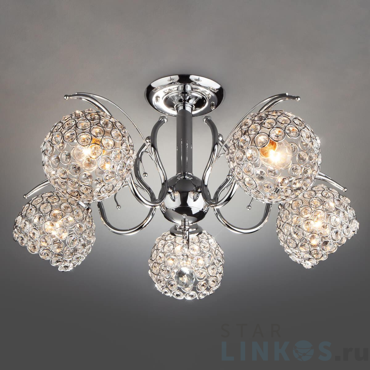 Поставщик рекомендует использовать лампы накаливания с цоколем E27. Потолочная люстра Eurosvet 7777/5 хром в используется в интерьере спальни с установкой на потолок.