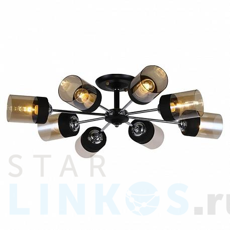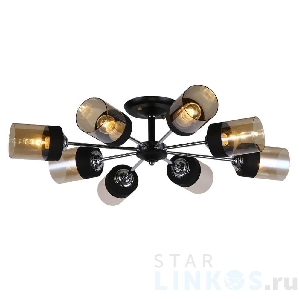 Поставщик рекомендует использовать лампы накаливания с цоколем E27 для освещения площади 26,7 м2. Потолочная люстра Hiper Orlando H111-8 в современном стиле используется в интерьере гостиной с установкой на потолок.