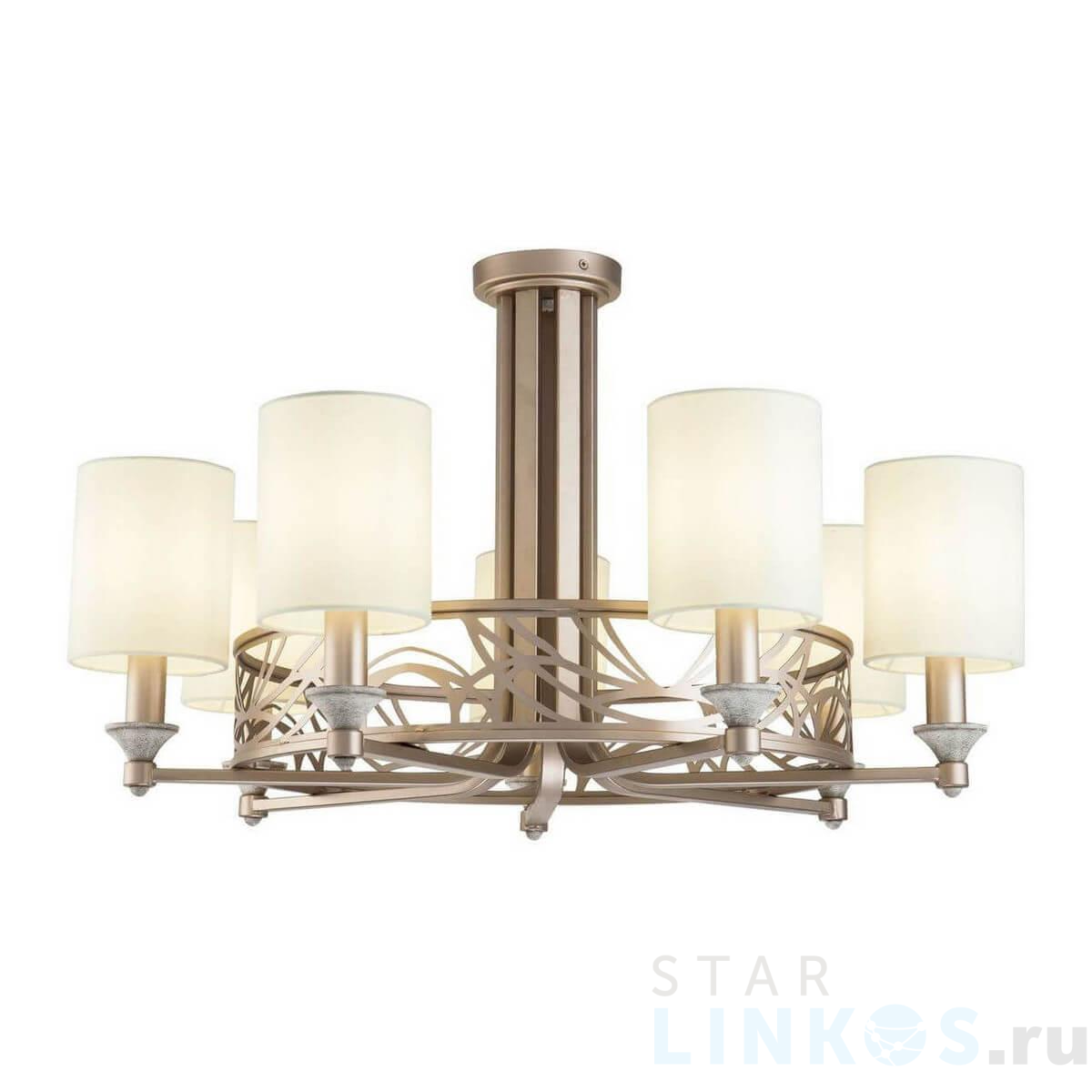 Поставщик рекомендует использовать лампы накаливания с цоколем E14 для освещения площади 15,6 м2. Потолочная люстра Maytoni Vittoria H004CL-07BG в используется в интерьере гостиной с установкой на потолок.