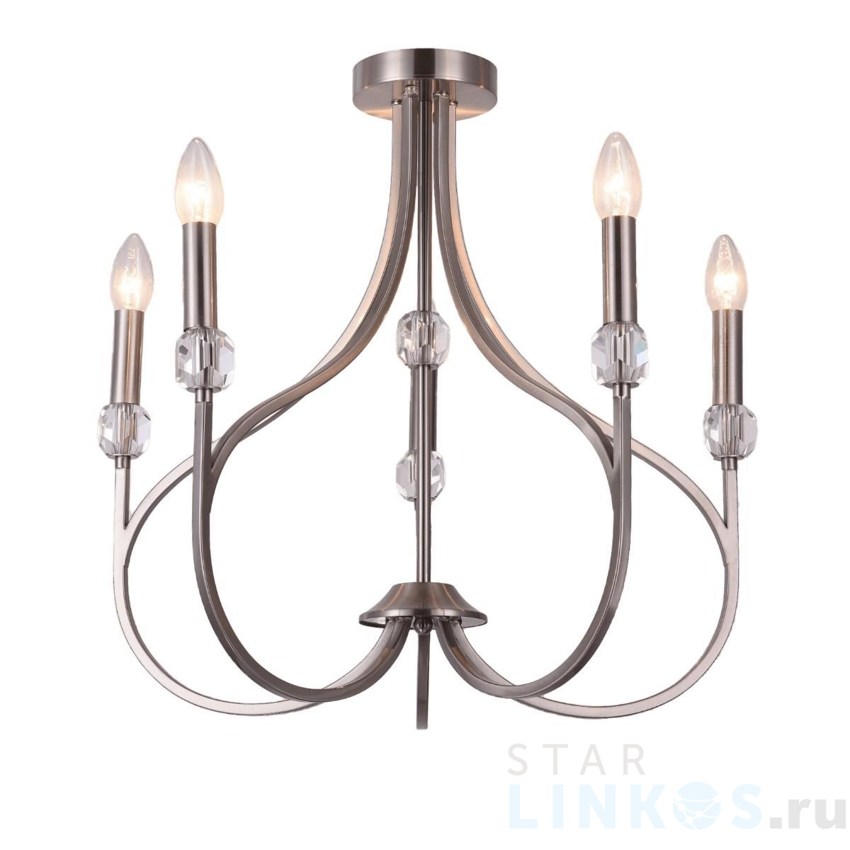 Поставщик рекомендует использовать лампы накаливания с цоколем E14 для освещения площади 14 м2. Потолочная люстра MyFar Lena MR1891-5C в современном стиле используется в интерьере гостиной с установкой на потолок.