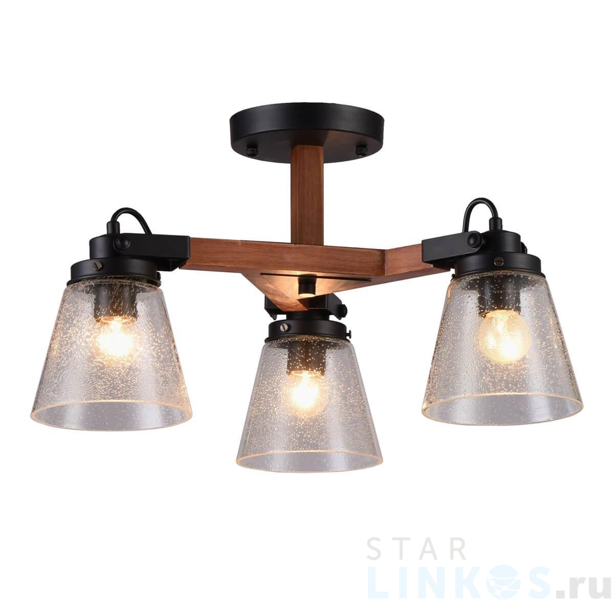 Поставщик рекомендует использовать лампы накаливания с цоколем E27 для освещения площади 7 м2. Потолочная люстра Omnilux Borgo OML-51007-03 в кантри-стиле используется в интерьере спальни с установкой на потолок.