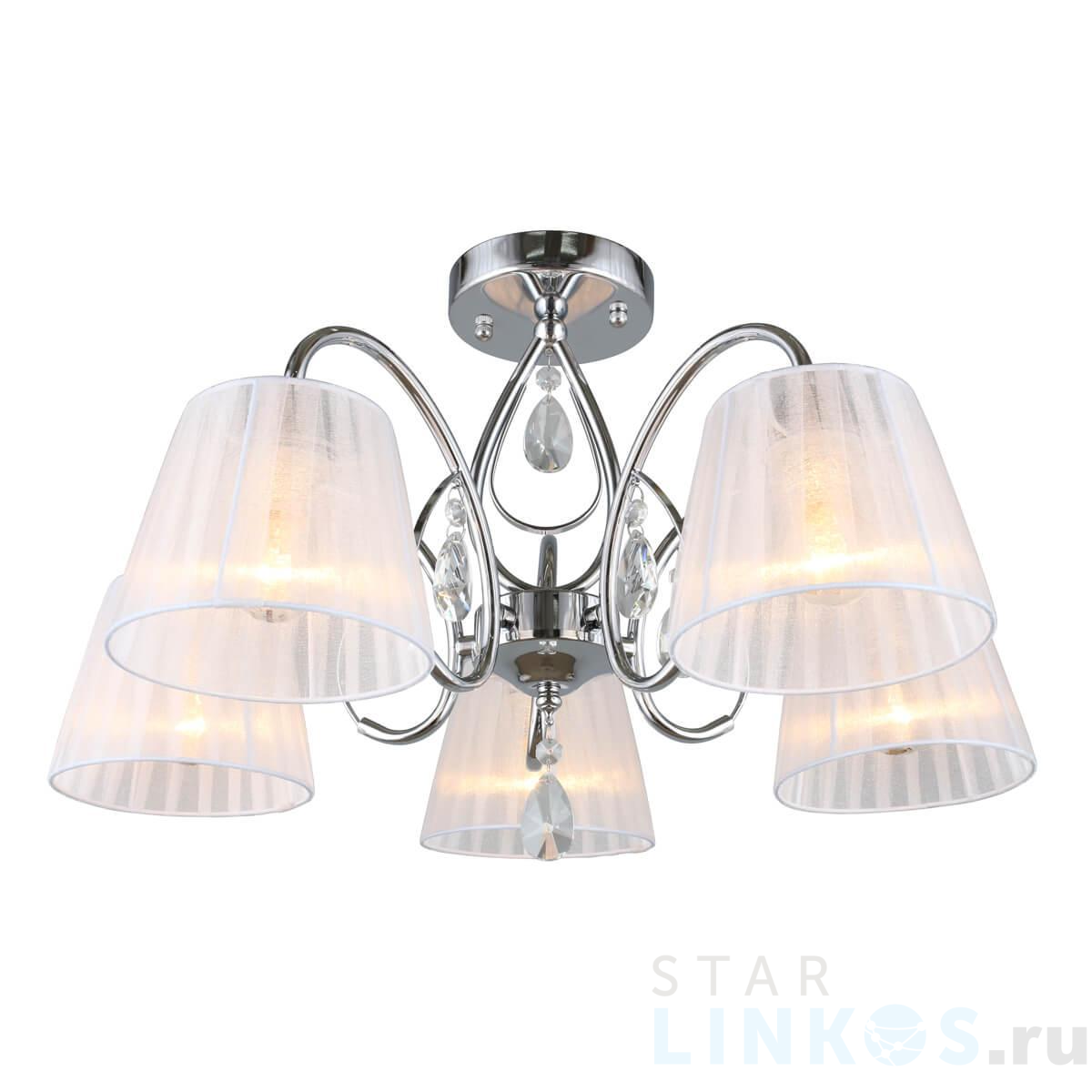 Поставщик рекомендует использовать лампы накаливания с цоколем E14 для освещения площади 15 м2. Потолочная люстра Omnilux Cardillo OML-56607-05 в классическом стиле используется в интерьере спальни с установкой на потолок.