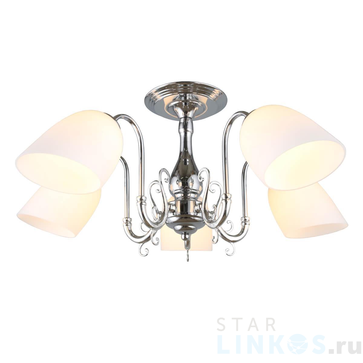 Поставщик рекомендует использовать лампы накаливания с цоколем E27 для освещения площади 15 м2. Потолочная люстра Omnilux Leonessa OML-29107-05 в классическом стиле используется в интерьере спальни с установкой на потолок.