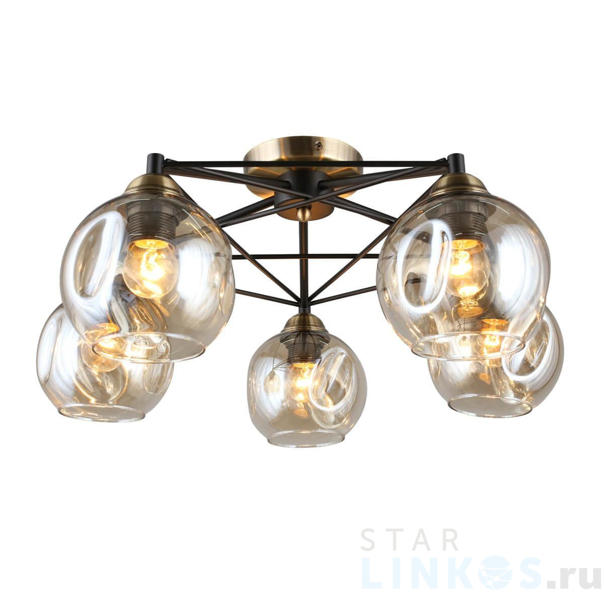 Поставщик рекомендует использовать лампы накаливания с цоколем E27 для освещения площади 10 м2. Потолочная люстра Omnilux Tuenno OML-93507-05 в стиле лофт используется в интерьере спальни с установкой на потолок.