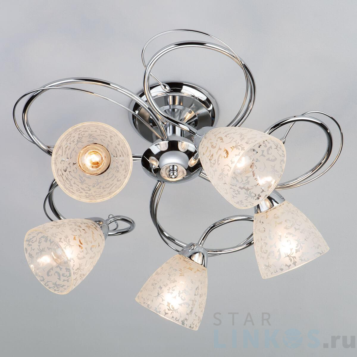 Поставщик рекомендует использовать лампы накаливания с цоколем E14. Потолочный светильник Eurosvet 30130/5 хром в современном стиле используется в интерьере спальни с установкой на потолок.