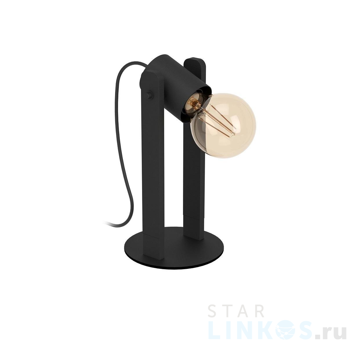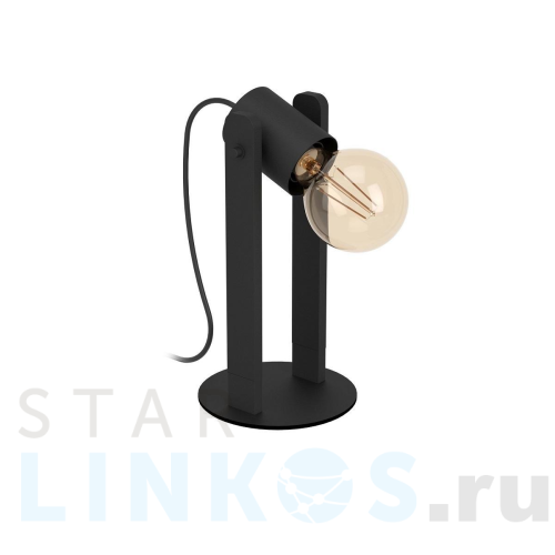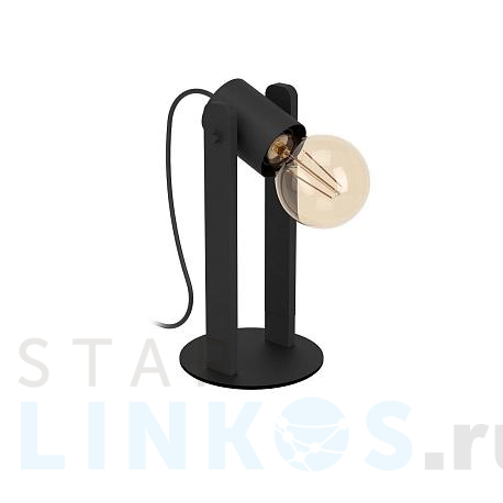 Поставщик рекомендует использовать лампы накаливания с цоколем E27. Настольная лампа Eglo Plimsoll 43849 в стиле лофт используется в интерьере спальни с установкой на стол.