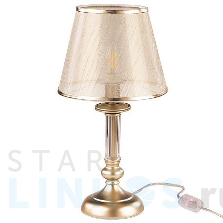 Поставщик рекомендует использовать лампы накаливания с цоколем E14. Настольная лампа Freya Ksenia FR2539TL-01G в классическом стиле используется в интерьере спальни с установкой на стол.