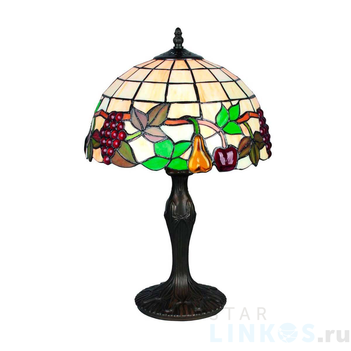Поставщик рекомендует использовать лампы накаливания с цоколем E27 для освещения площади 3,3 м2. Настольная лампа Omnilux OML-80304-01 в стиле Тиффани используется в интерьере кухни с установкой на стол.