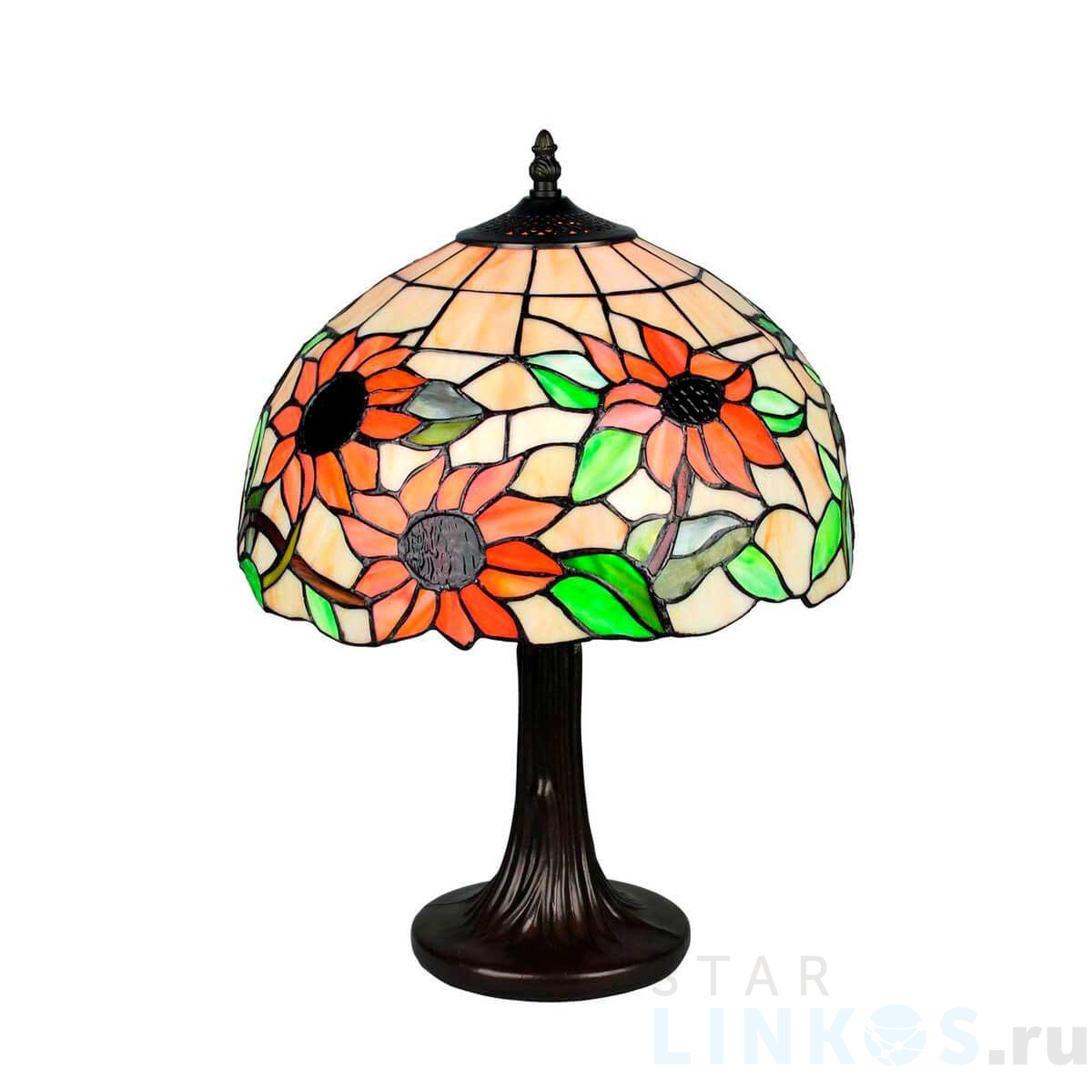 Поставщик рекомендует использовать лампы накаливания с цоколем E27 для освещения площади 3,3 м2. Настольная лампа Omnilux OML-80704-01 в стиле Тиффани используется в интерьере кухни с установкой на стол.