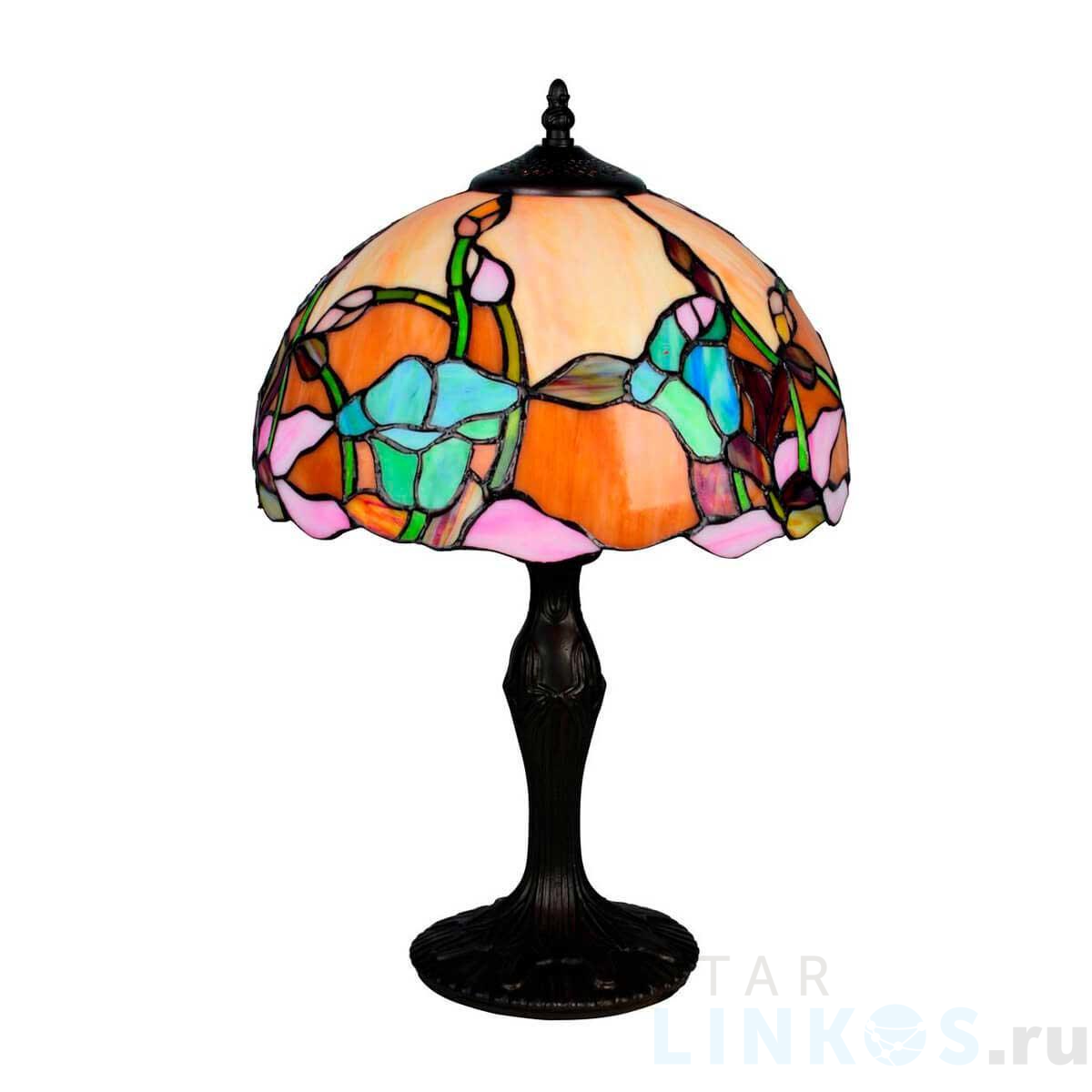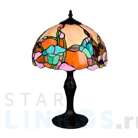 Поставщик рекомендует использовать лампы накаливания с цоколем E27 для освещения площади 3,3 м2. Настольная лампа Omnilux OML-80904-01 в стиле Тиффани используется в интерьере кухни с установкой на стол.