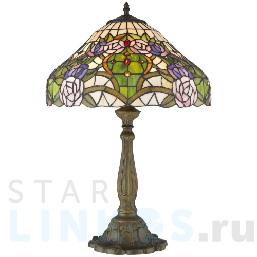 Поставщик рекомендует использовать лампы накаливания с цоколем E27 для освещения площади 3,3 м2. Настольная лампа Velante 842-804-01 в стиле Тиффани используется в интерьере спальни с установкой на стол.