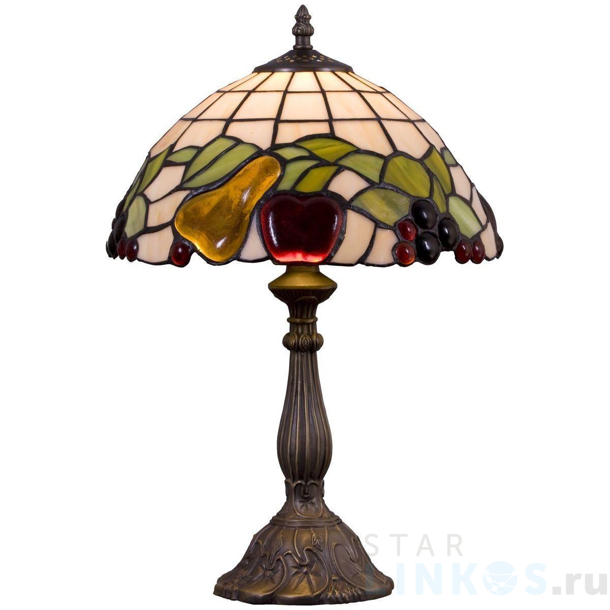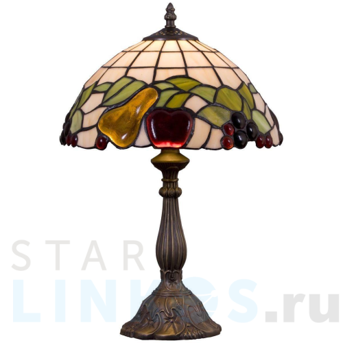 Поставщик рекомендует использовать лампы накаливания с цоколем E27 для освещения площади 3,3 м2. Настольная лампа Velante 850-804-01 в стиле Тиффани используется в интерьере кухни с установкой на стол.