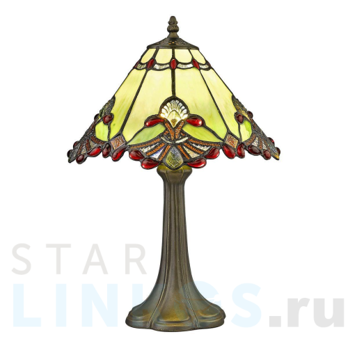 Поставщик рекомендует использовать лампы накаливания с цоколем E27 для освещения площади 2 м2. Настольная лампа Velante 863-824-01 в стиле Тиффани используется в интерьере кухни с установкой на стол.