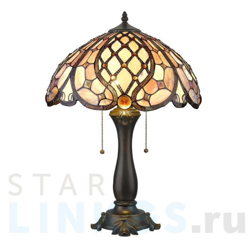 Поставщик рекомендует использовать лампы накаливания с цоколем E27 для освещения площади 6 м2. Настольная лампа Velante 865-804-02 в стиле Тиффани используется в интерьере гостиной с установкой на стол.